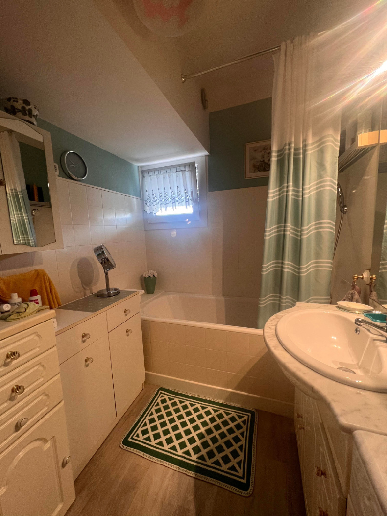 Cet appartement comprend : Entrée, salon-séjour, cuisine aménagée, dégagement, WC indépendant, salle d'eau, deux chambres.