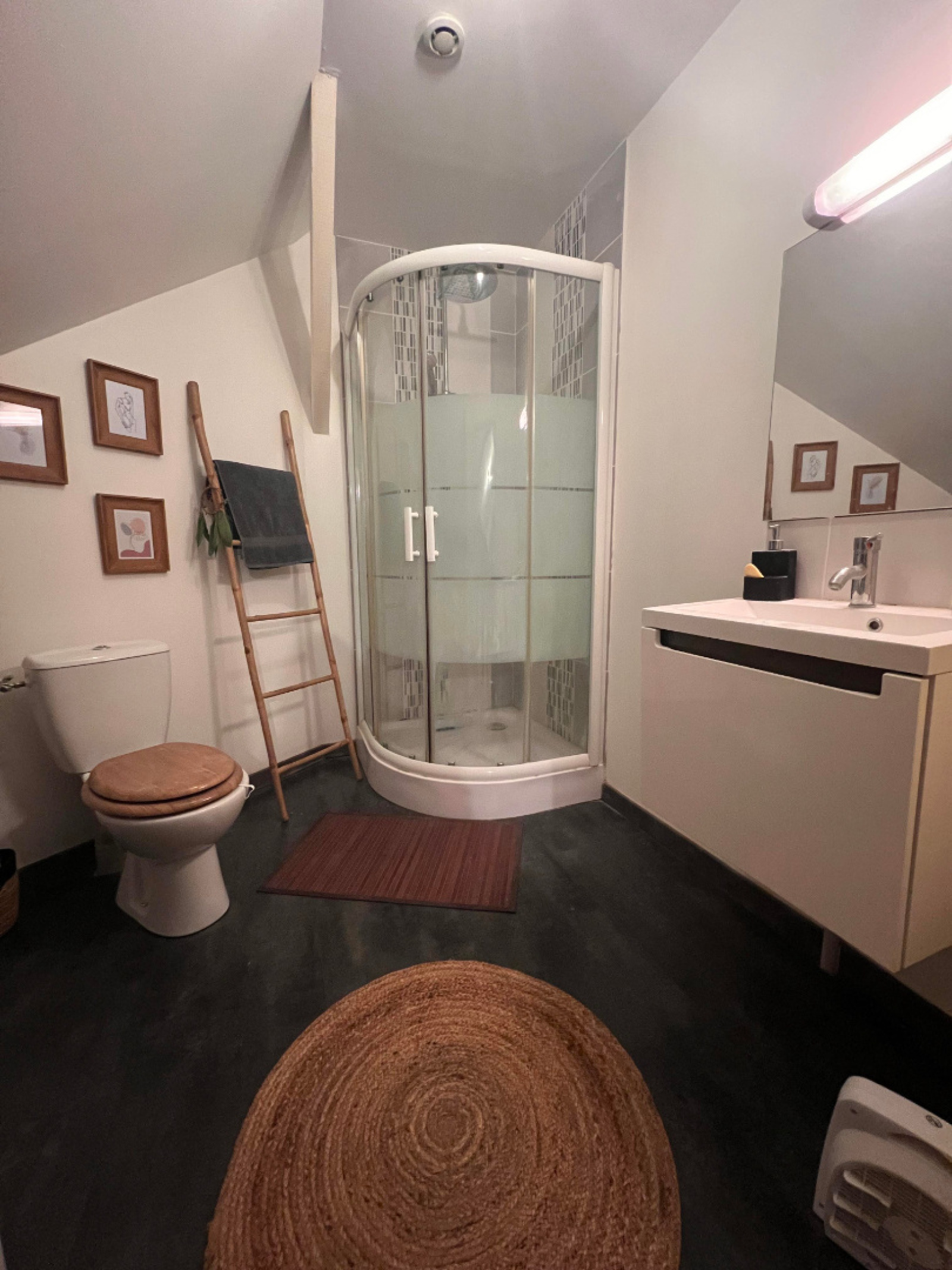 A l'étage : mezzanine avec partie bureau, 1 chambre, 1 salle d'eau avec wc et douche.