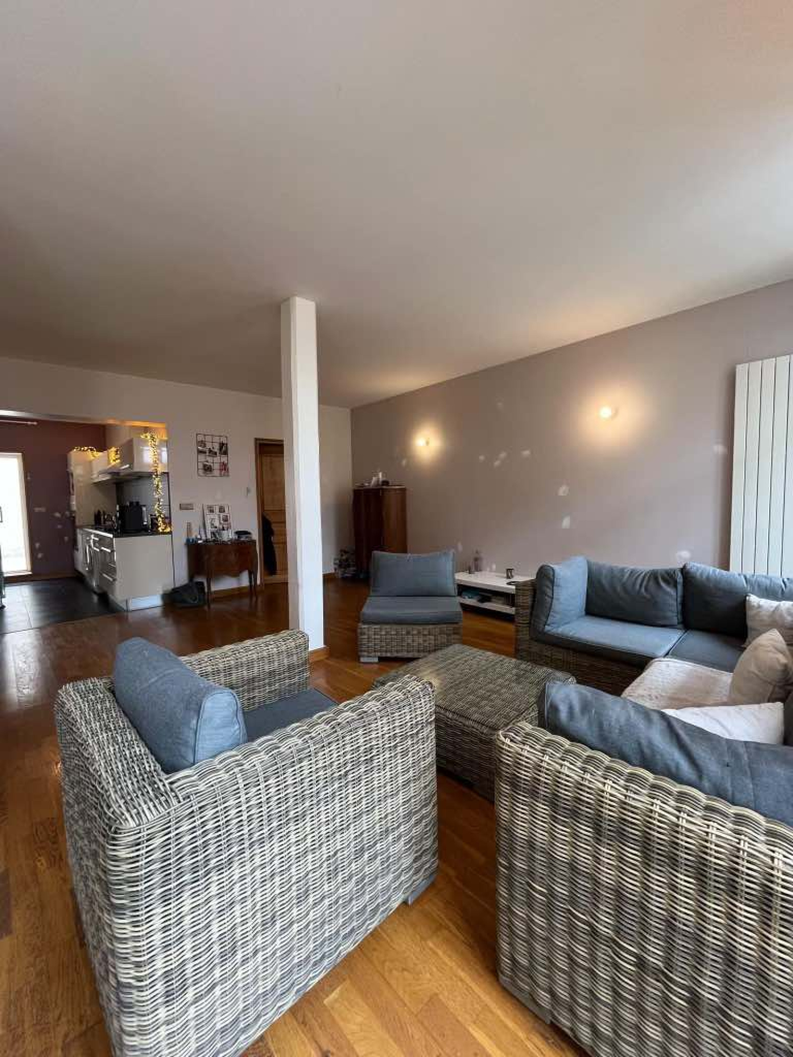 Entrée avec dressing intégrés, WC indépendant suspendu avec lave-mains, salle de bains (baignoire, emplacement machine à laver), espace de vie spacieux salon séjour avec cuisine ouverte et équipée tplaque vitro, hotte, four, lave-vaiselles) accès terrasse, trois chambres spacieuses.
