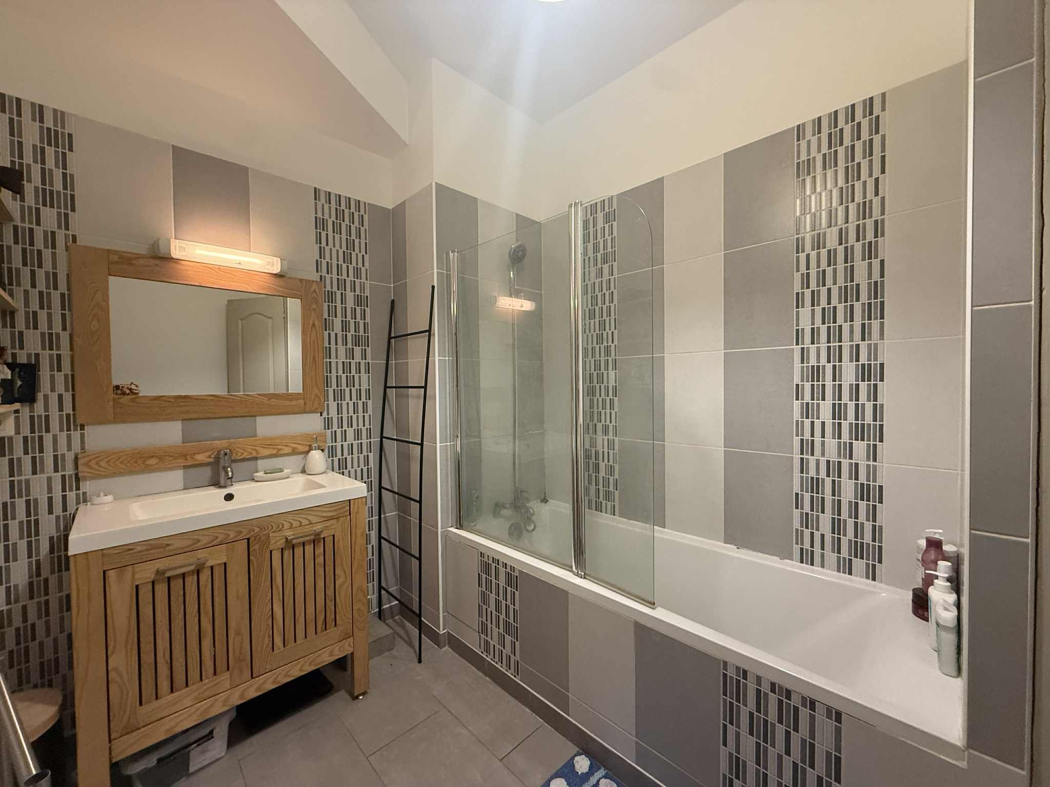 Entrée, un WC indépendant, une salle de bains, séjour ouvert sur cuisine équipée, une chambre.