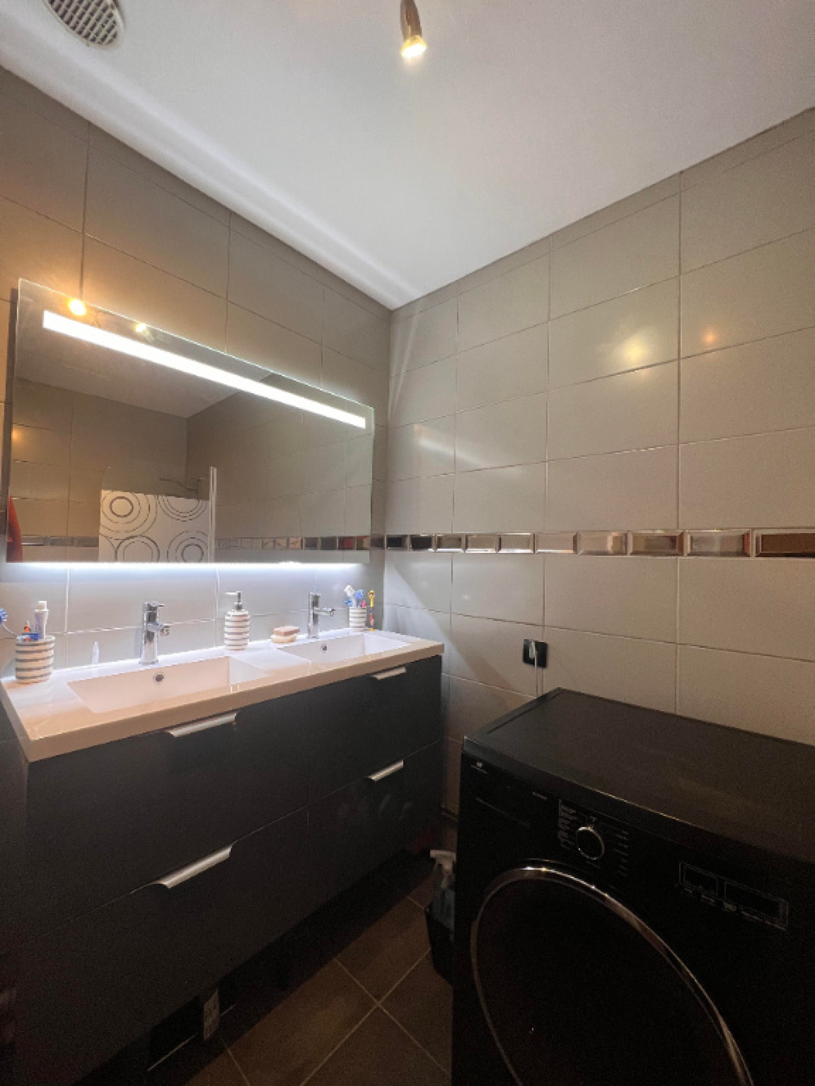 A l'étage : palier, deux chambres, une salle de bains (double-vasque et baignoire : rénové récemment).