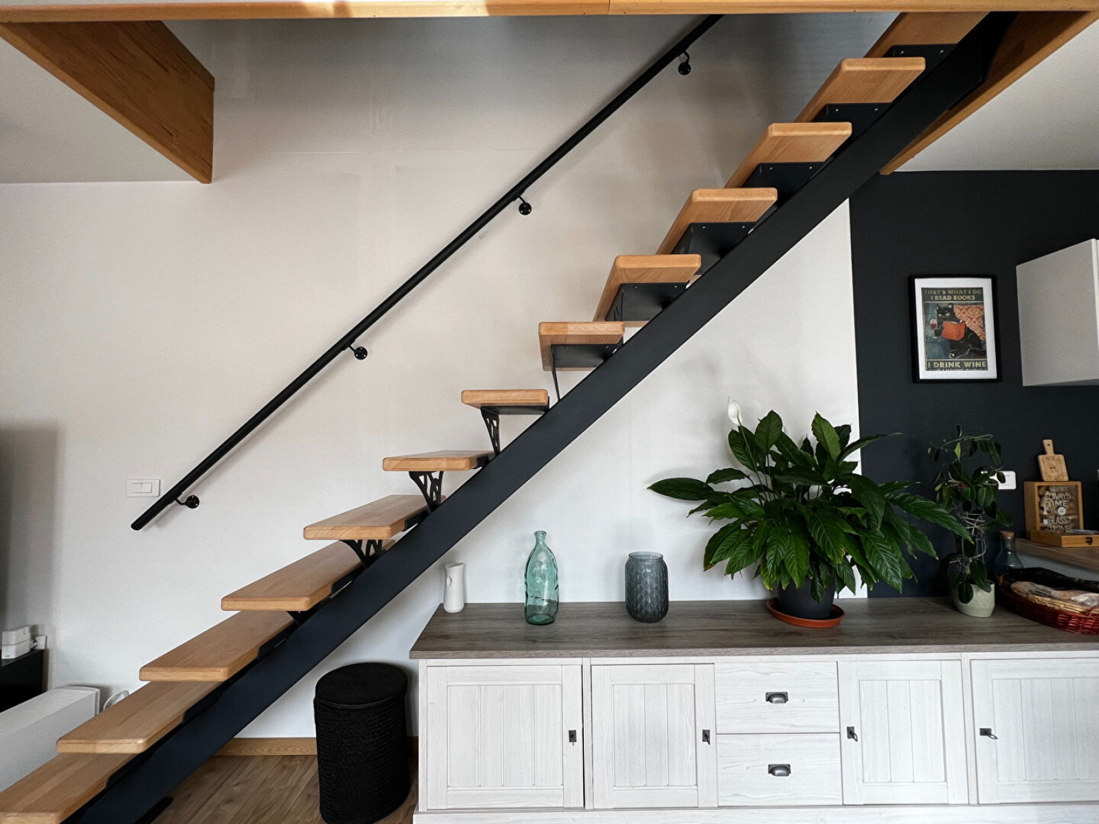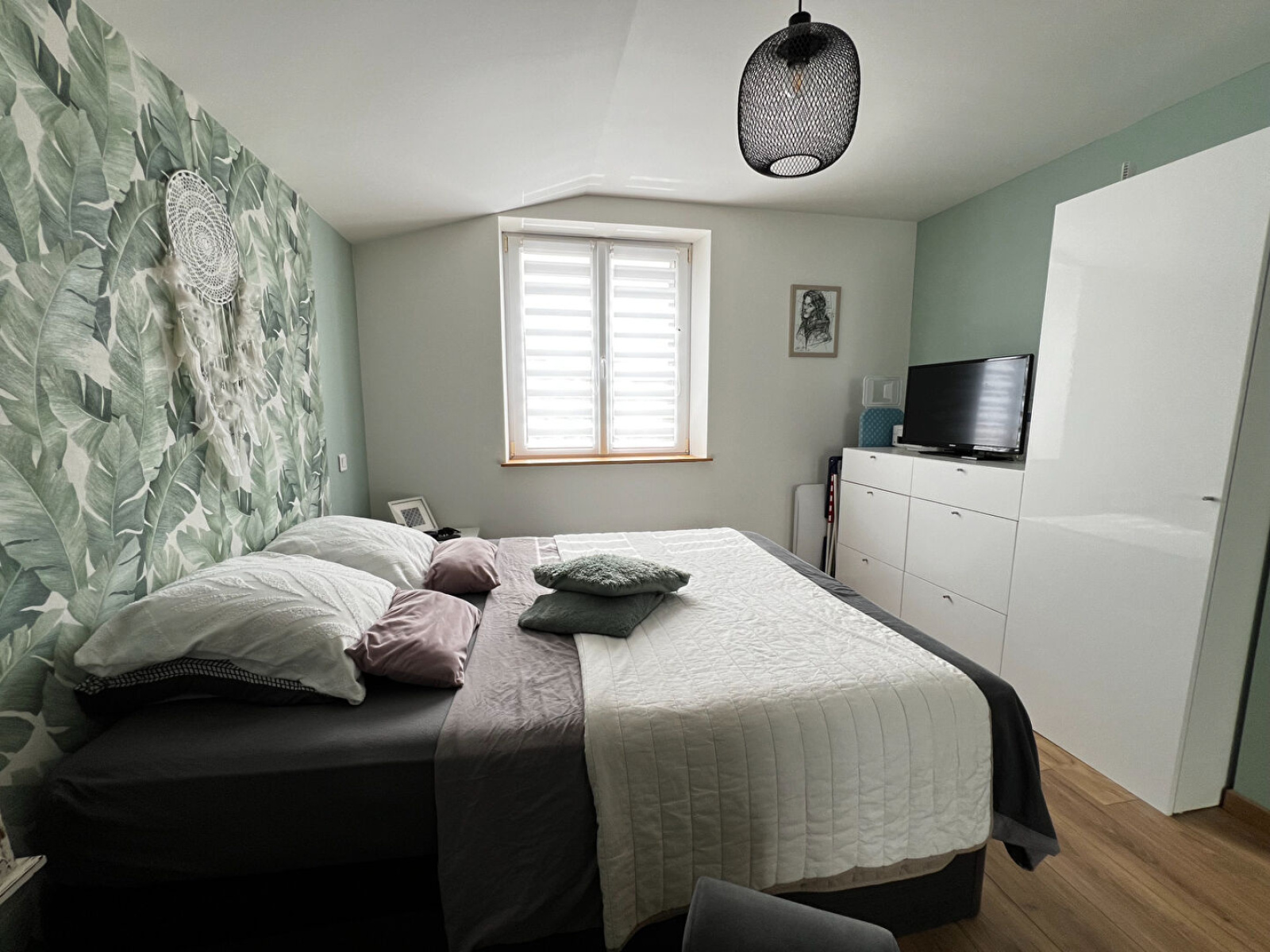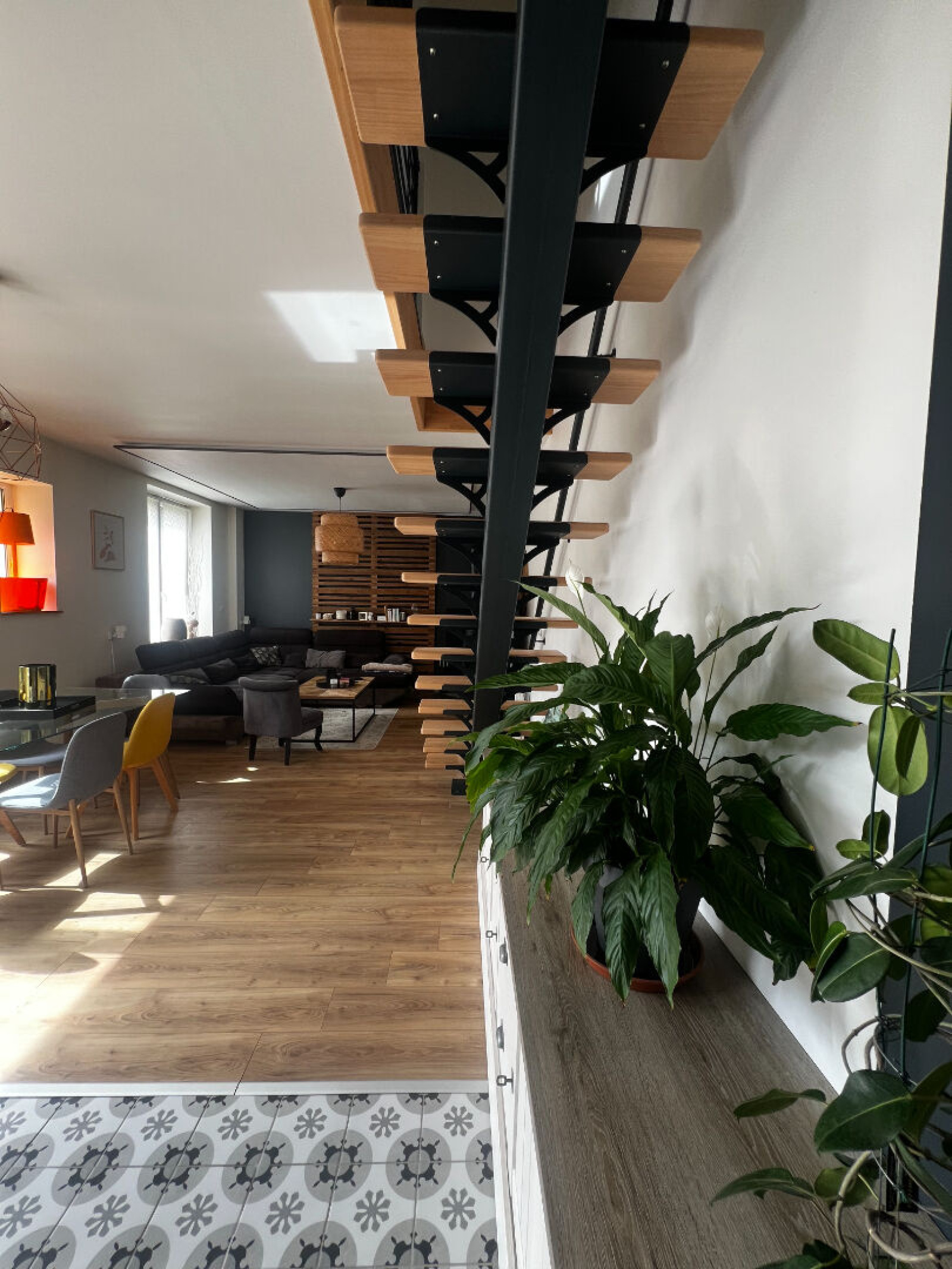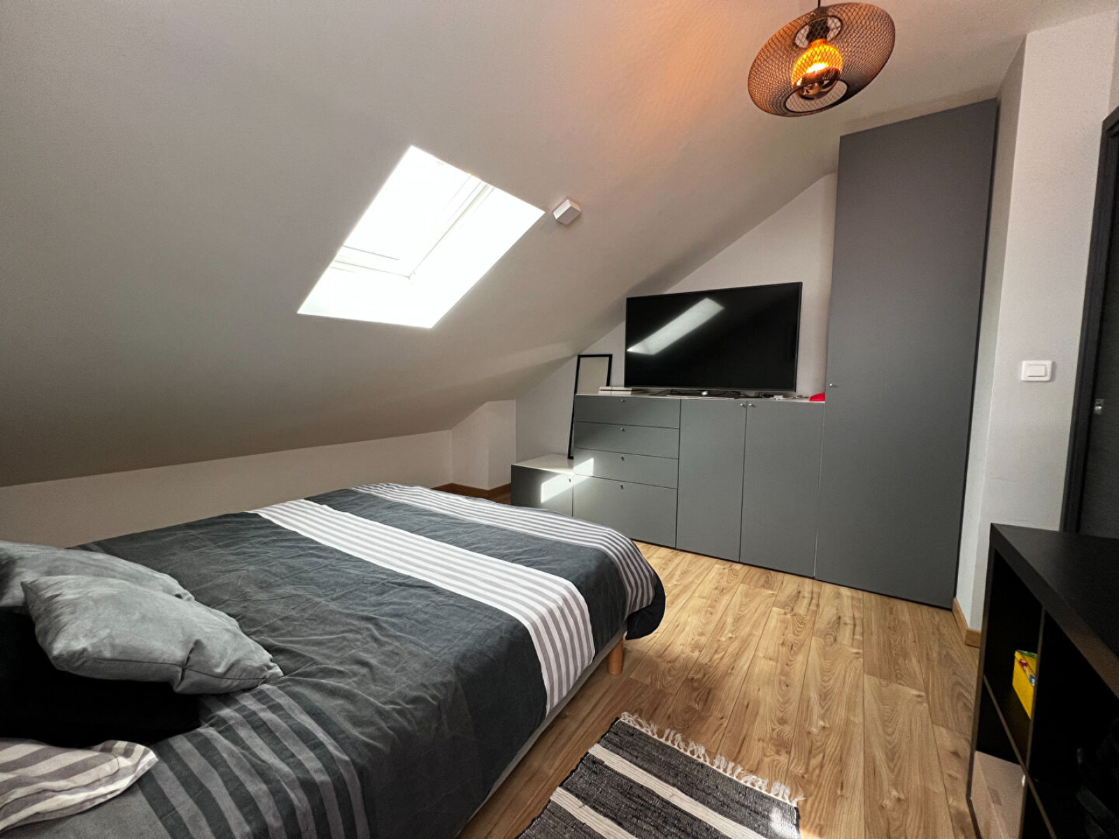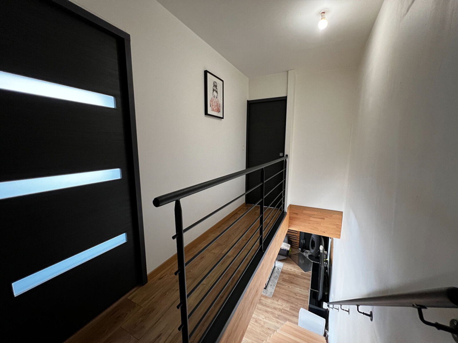 À l'étage accès par un superbe escalier bois et acier. Couloir desservant : Deux chambres lumineuses et spacieuses. Une salle de bains avec baignoire, vasque XL, douche, sèche serviettes et WC.