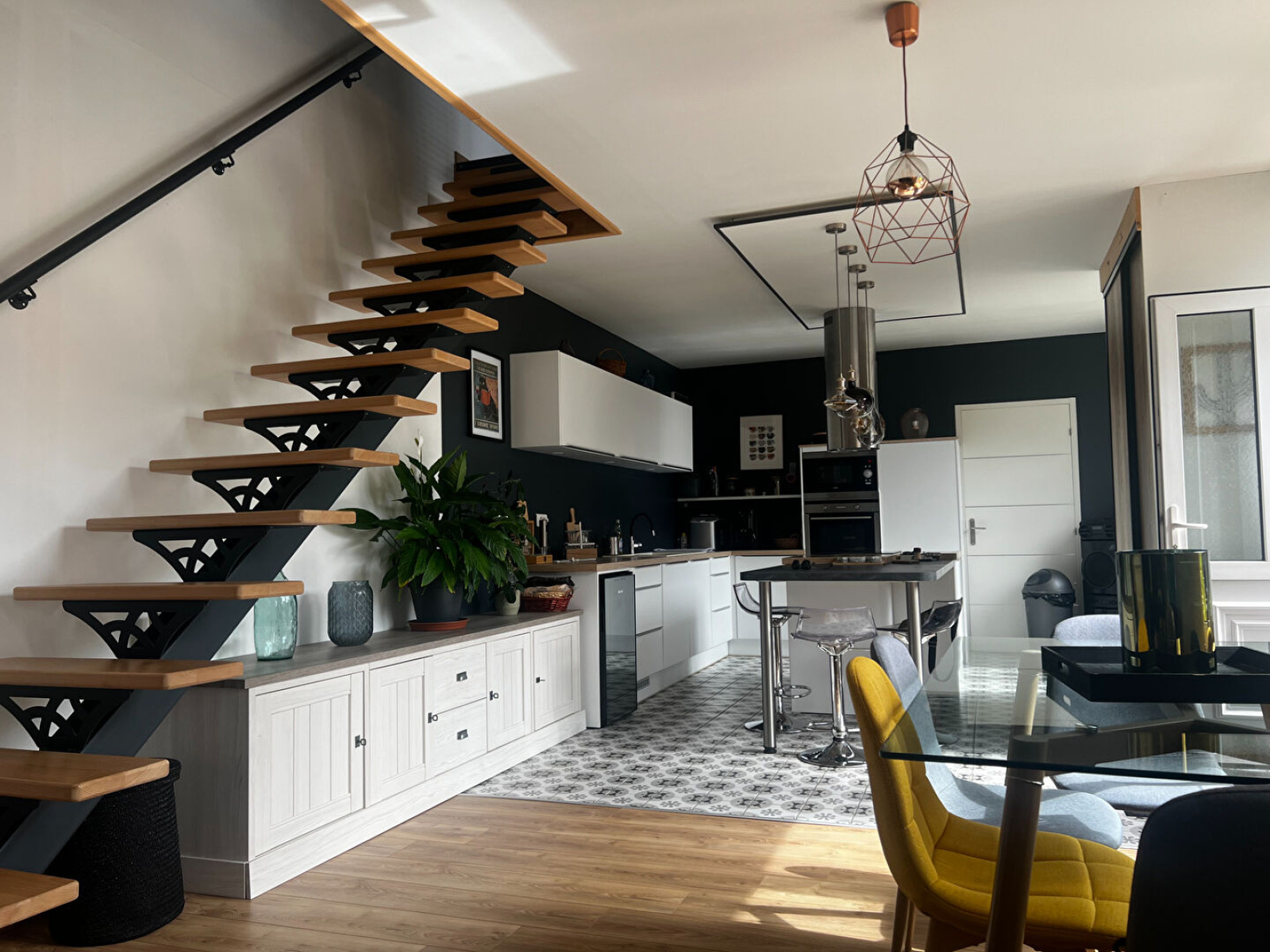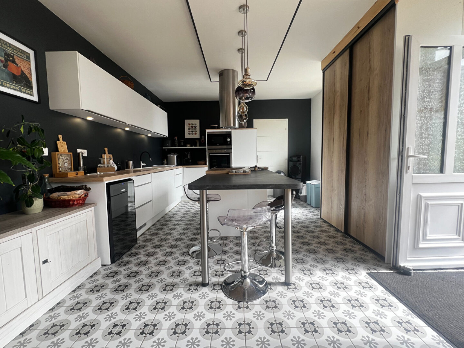 Entrée donnant dans une superbe pièce de vie de 48 m2 comprenant cuisine carrelée ultra récente et entièrement équipée ( plaque, hotte, four et micro-ondes, lave vaisselles, cave à vin et réfrigérateur). Séjour et salon en parquet avec poêle à bois. Un cellier avec espace buanderie et sanibroyer.