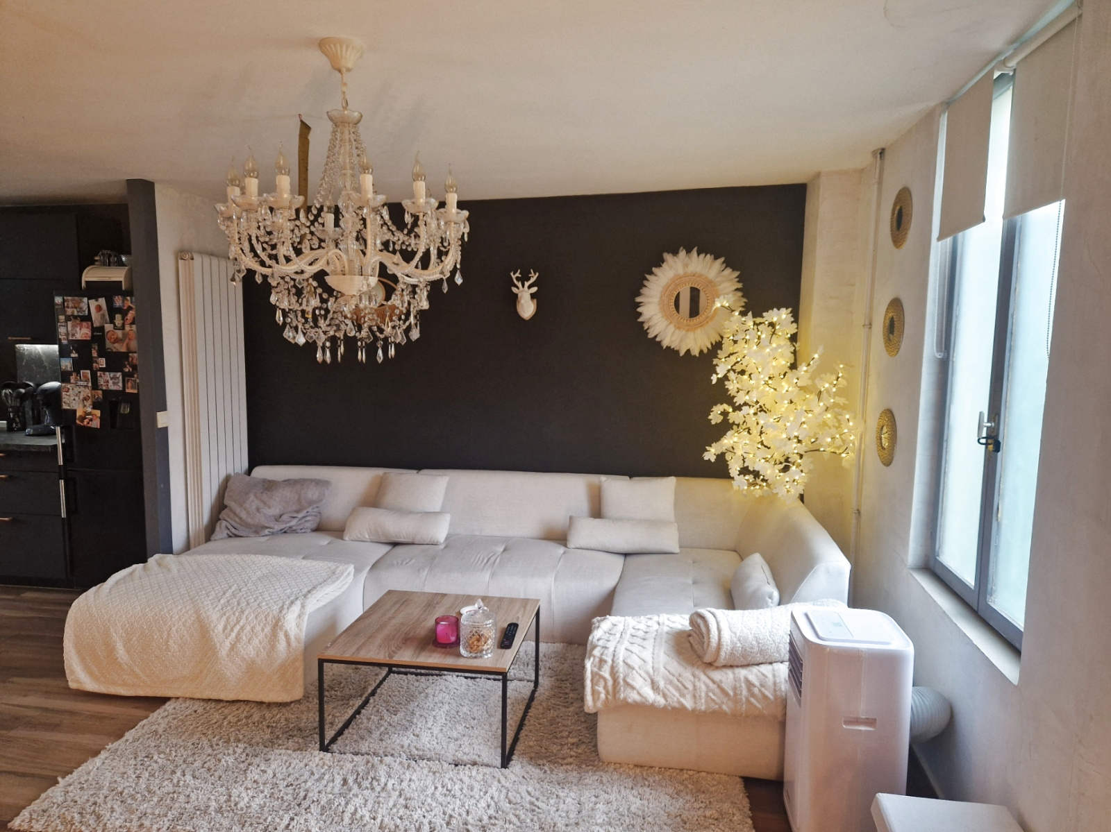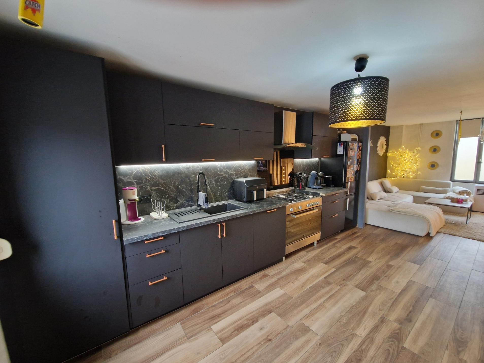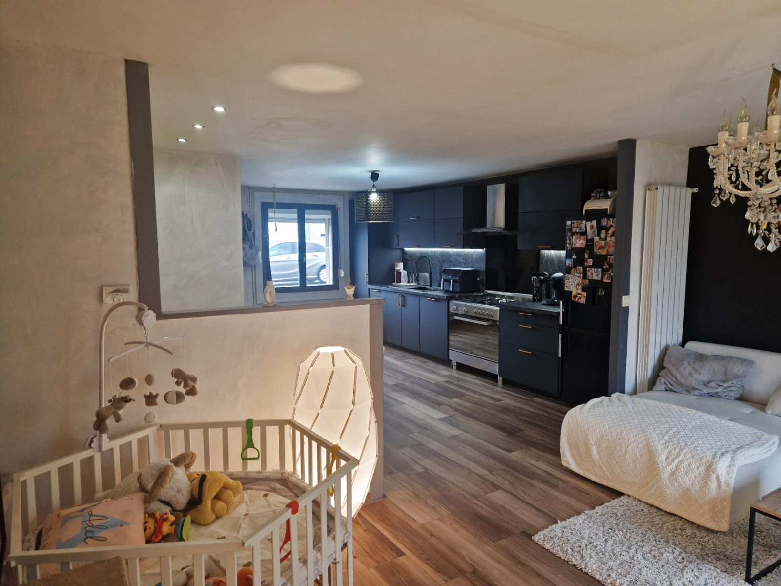RDC: entrée, salon séjour avec cuisine entièrement équipée, ouverte.