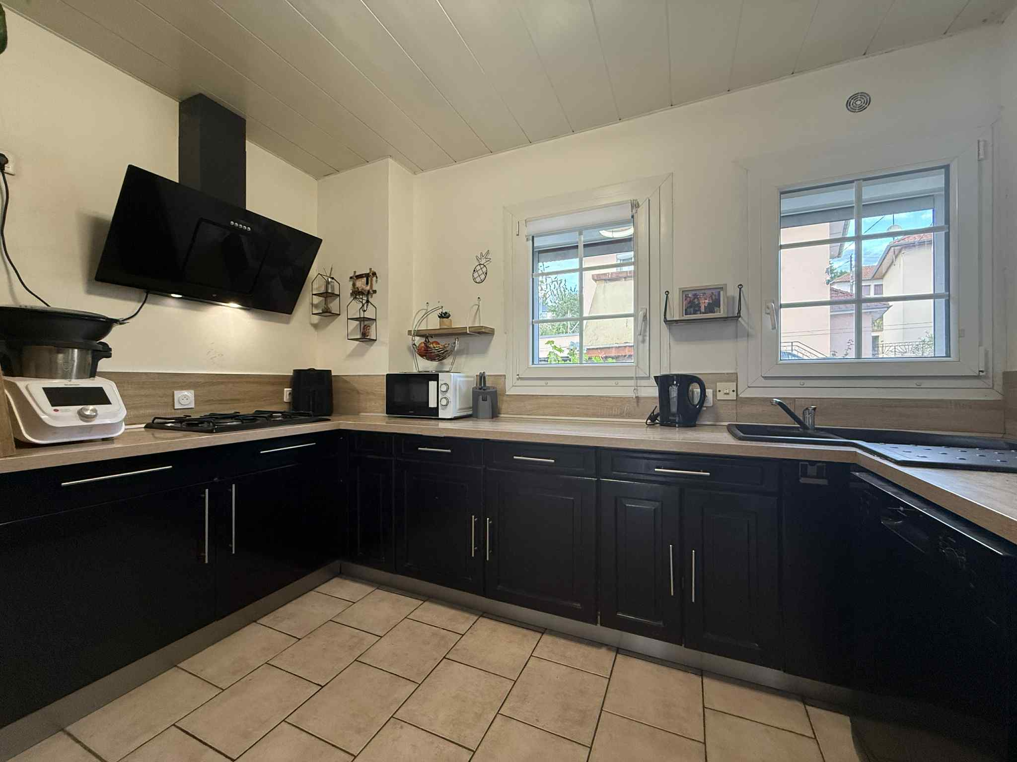 Au rez-de-chaussée, une entrée accueillante donnant sur une pièce de vie lumineuse avec une cuisine ouverte entièrement équipée (four, plaque, hotte, lave-vaisselle) et un WC indépendant avec lave-mains.