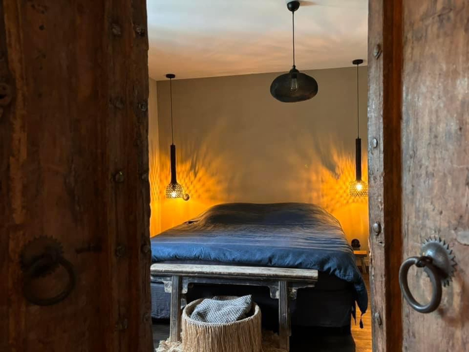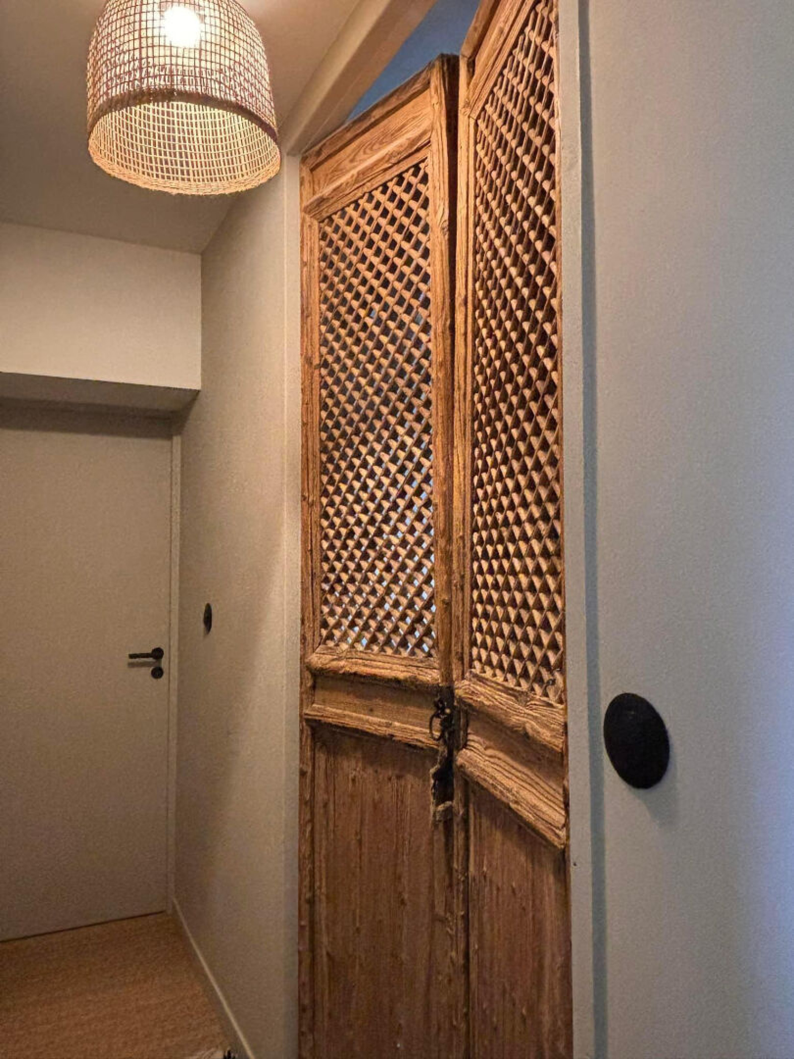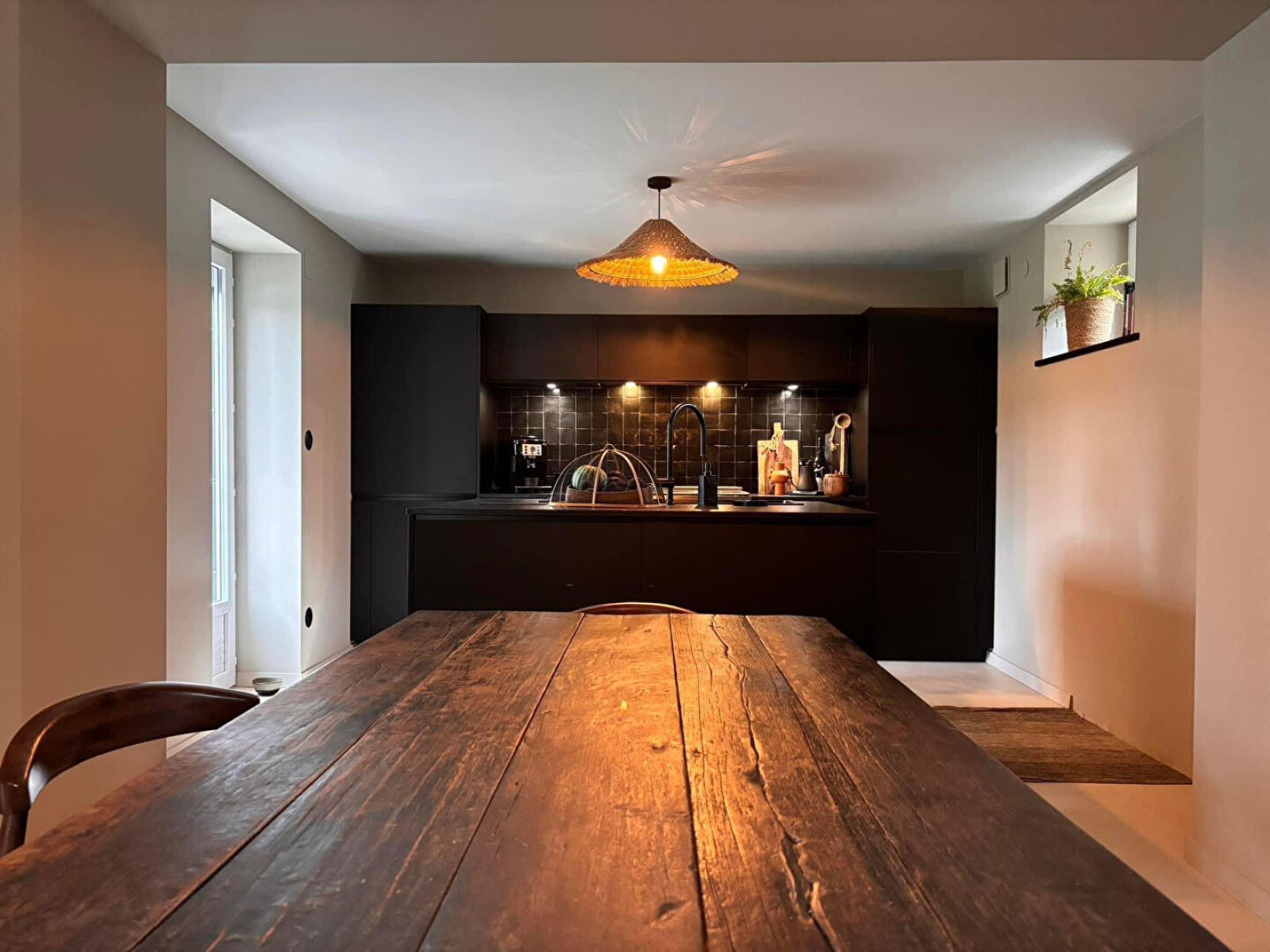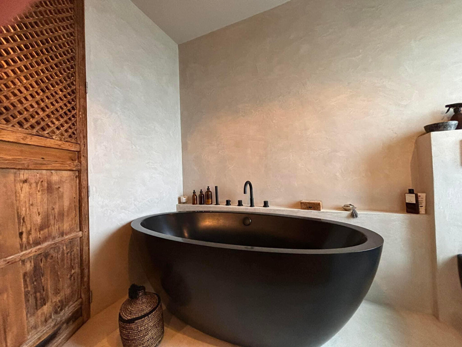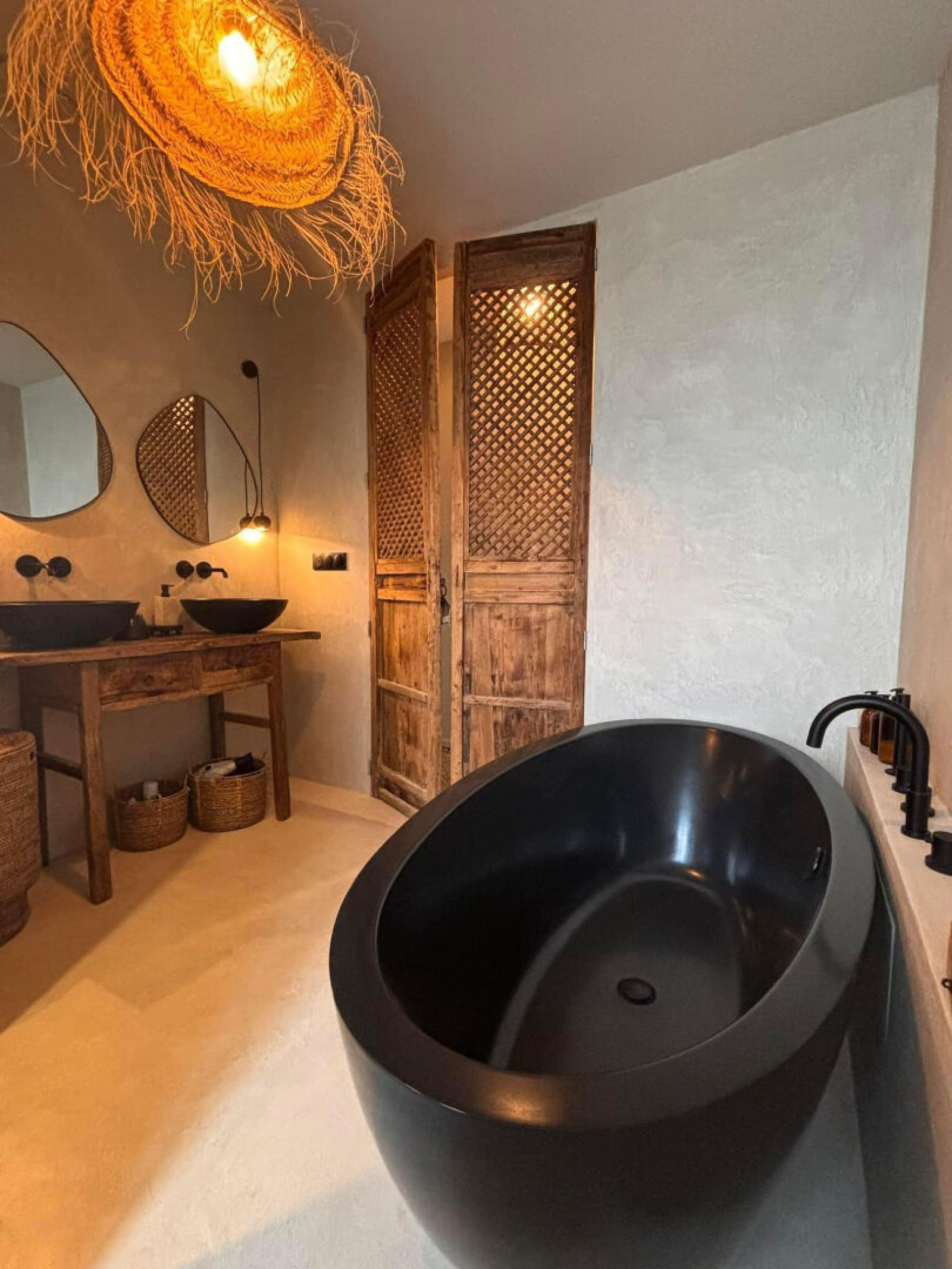 Portes indiennes, robinetterie et interrupteurs noir mat.