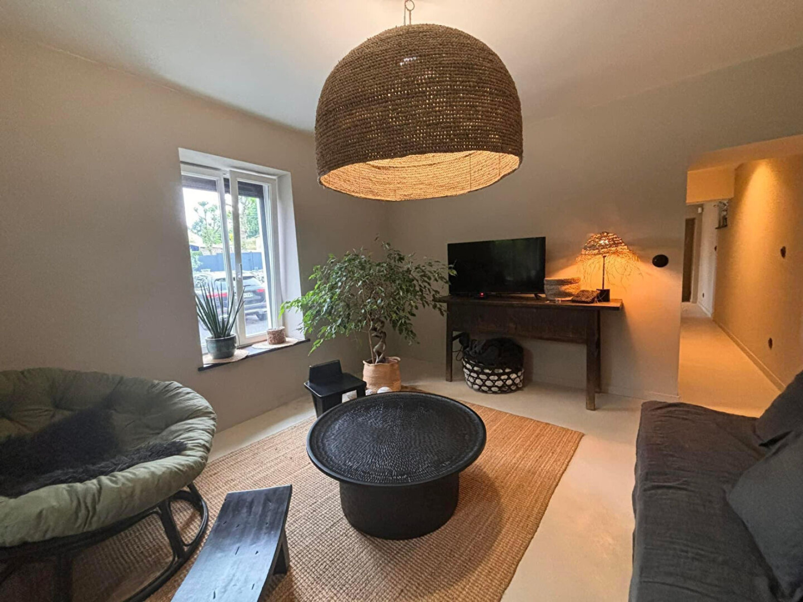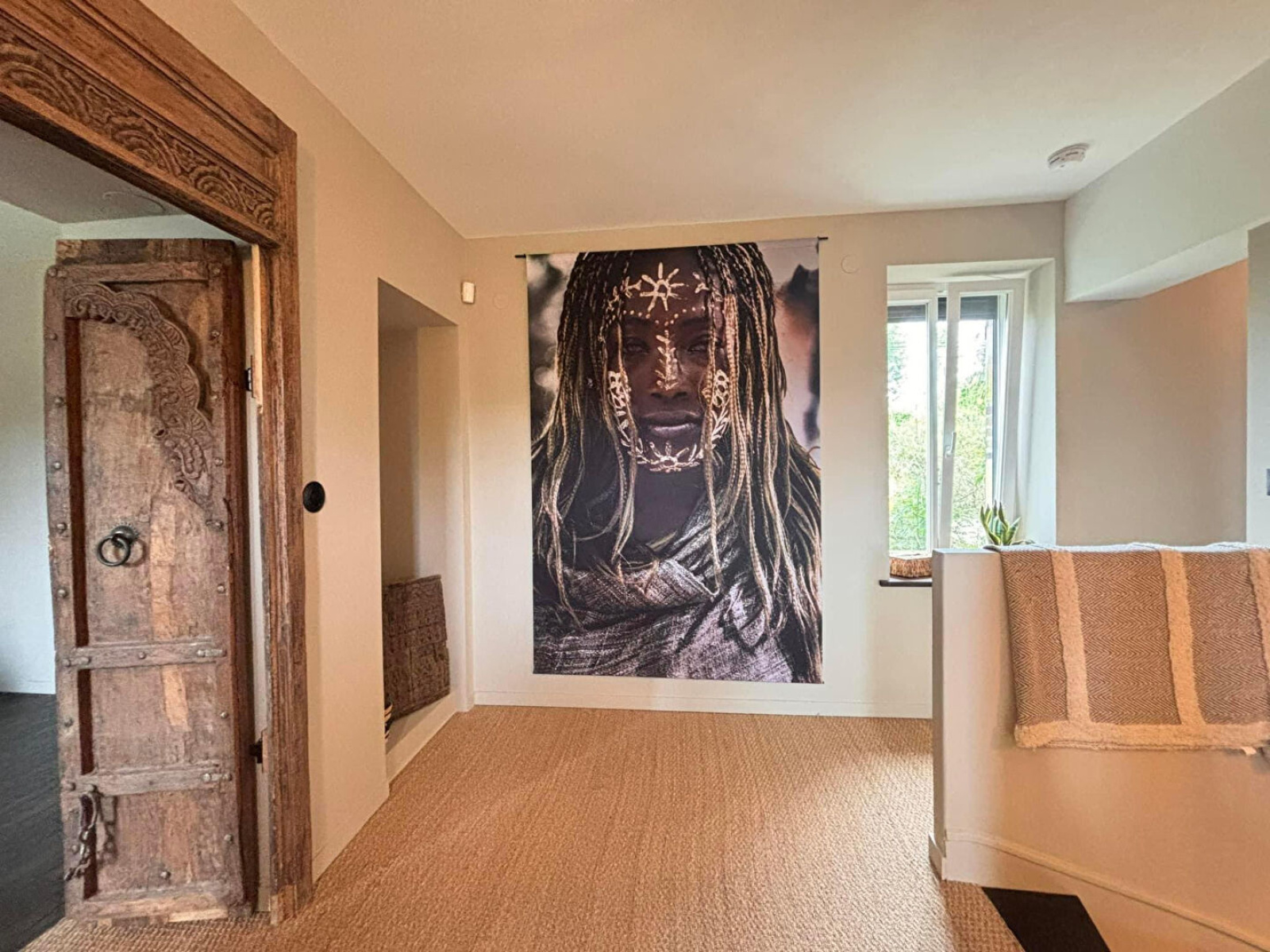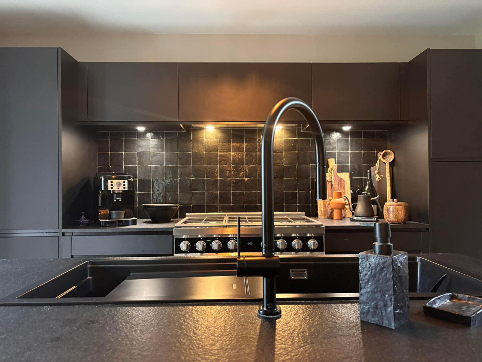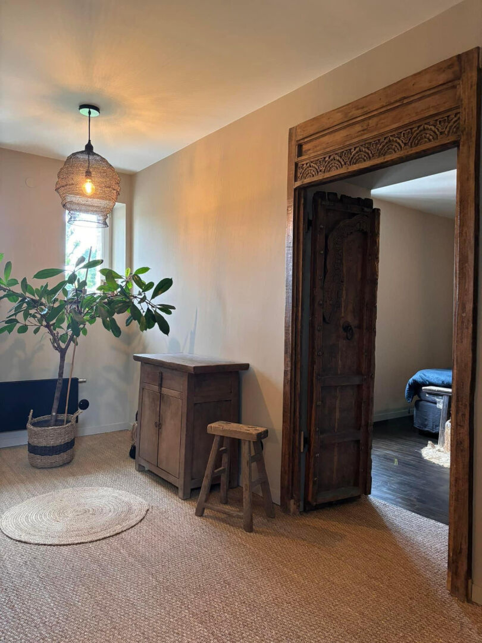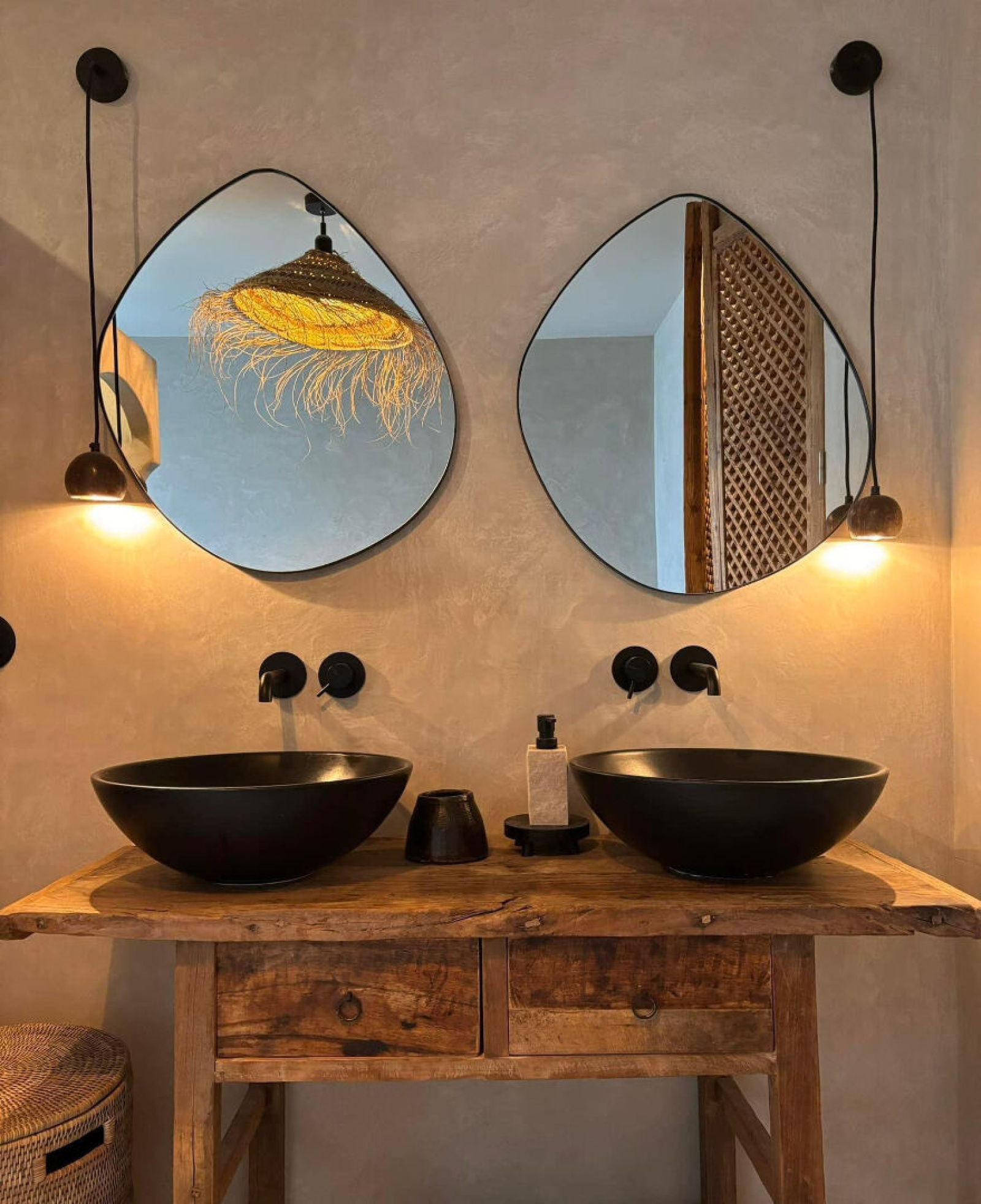 Portes indiennes, robinetterie et interrupteurs noir mat.