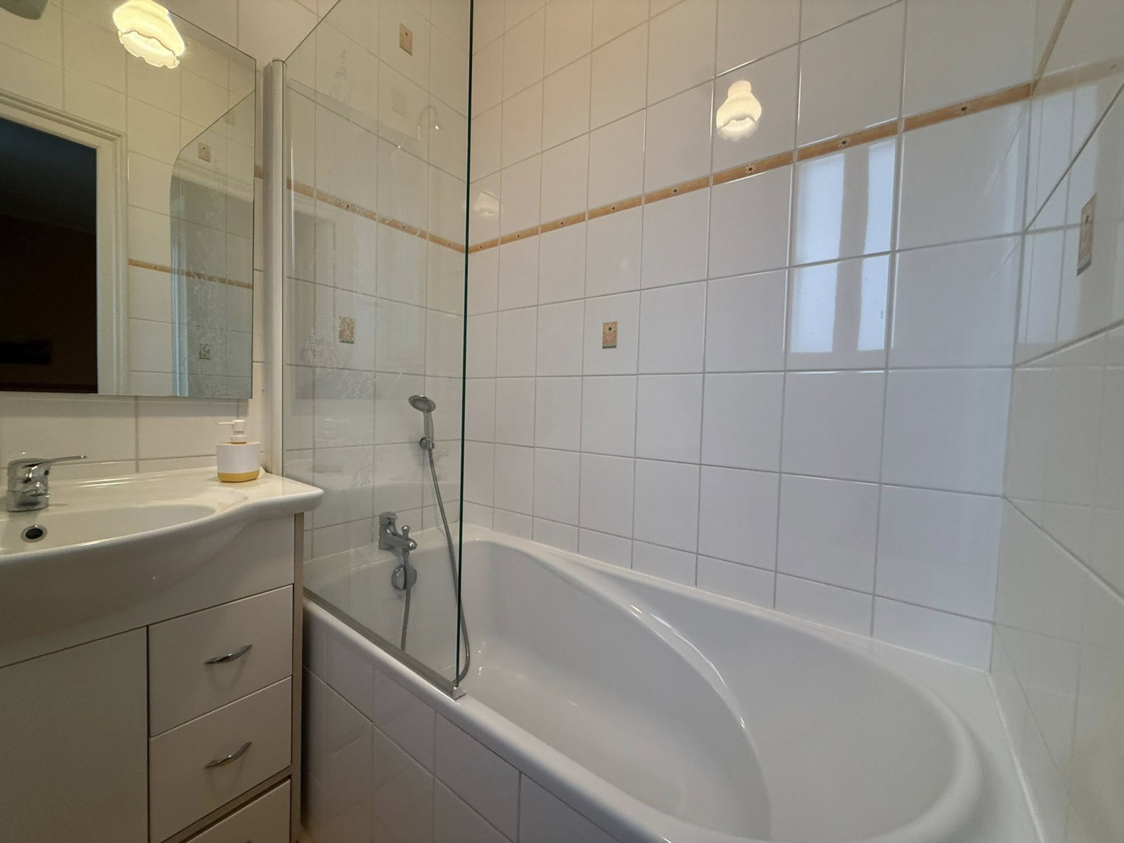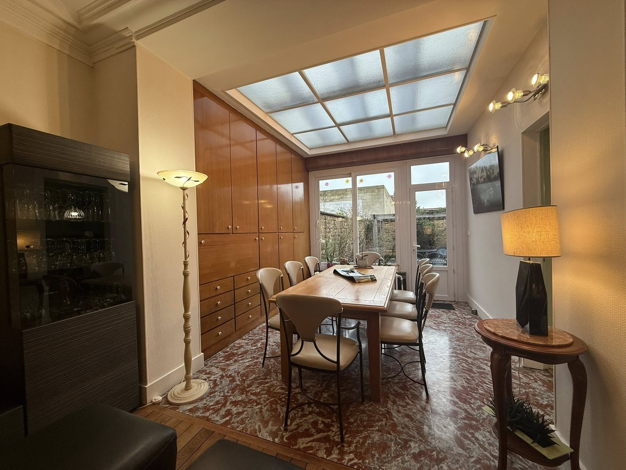 Rez-de-chaussée: belle entrée accueillante avec tommettes, vaste salon-séjour lumineux (sol en marbre) avec accès direct extérieur, bureau ou chambre, cuisine équipée fonctionnelle, grande cave + cave à vin.