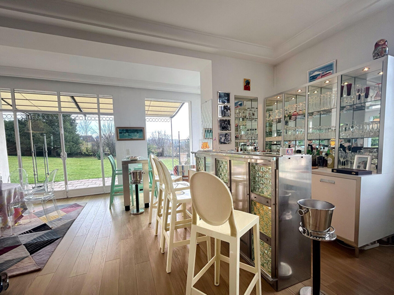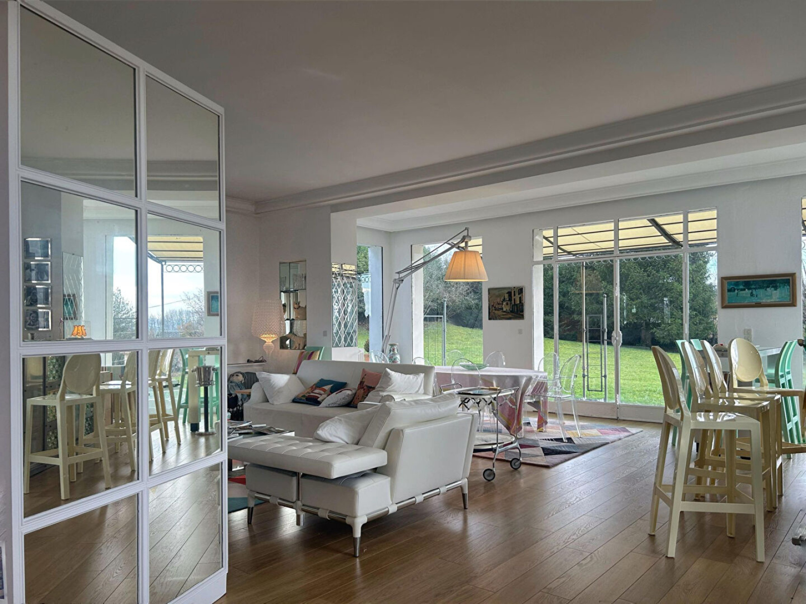 Cette propriété est composée de la manière suivante : Rez-de-chaussée : Une vaste entrée avec salon d'accueil, une très grande pièce de réception baignée de luminosité, salon-séjour avec espace bar donnant sur une terrasse exposée sud et sur un vaste parc. Cuisine équipée et arrière cuisine donnant sur une terrasse côté sud-est, WC indépendant avec vestiaire et lave-mains.