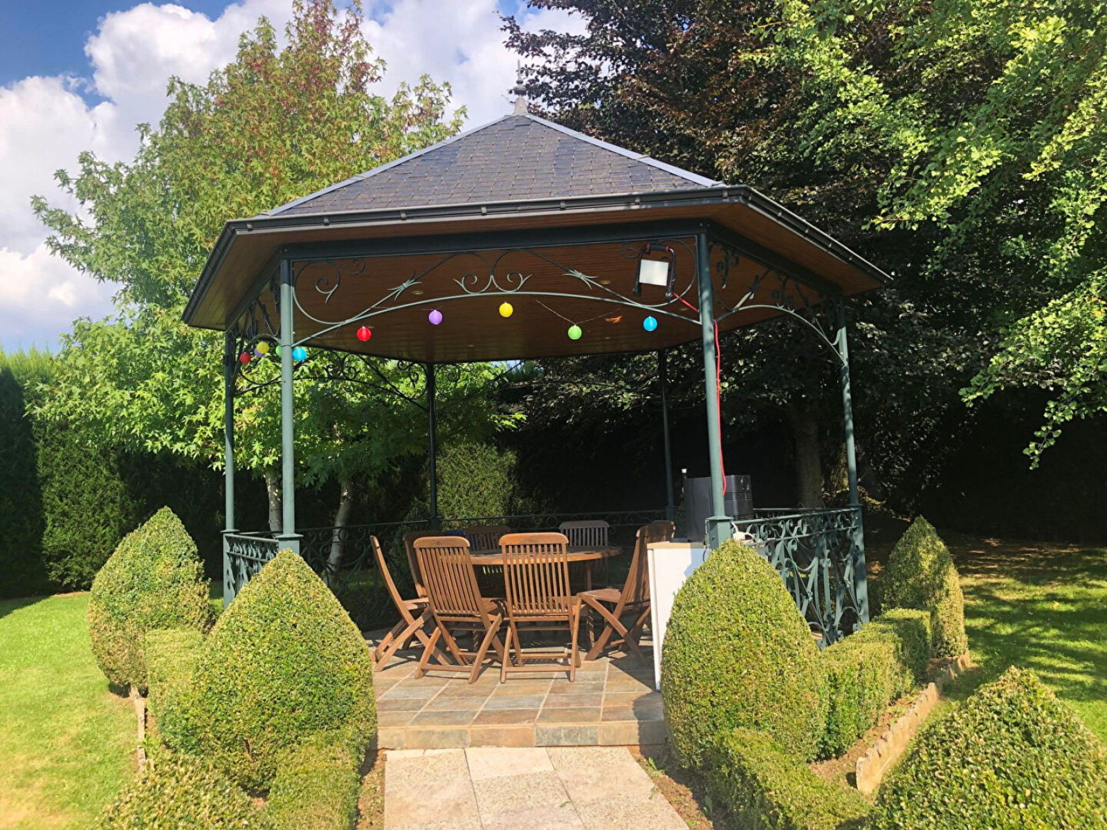A l'extérieur, profitez d'un superbe terrain arboré avec kiosque, d'une serre pour les amateurs de jardinage, et d'une belle cave à vin pour les passionnés d'oenologie.