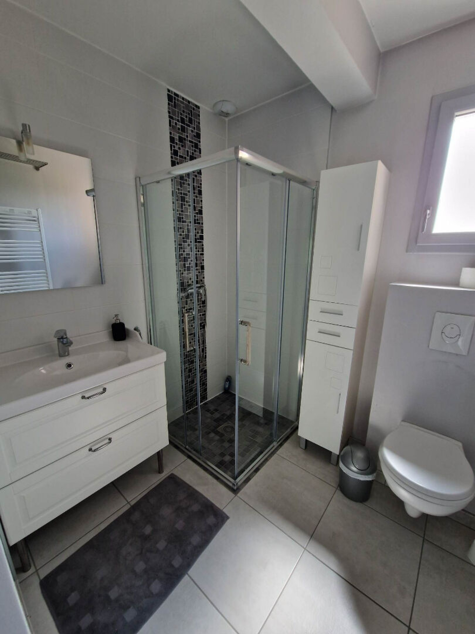 Une vaste entrée desservant un salon séjour avec accès terrasse et jardin, une cuisine équipée (four, four micro-ondes, plaque induction, hotte, lave vaisselles) et son cellier (coin buanderie, rangement), 1 chambre ou un bureau,1 salle d'eau avec 1 meuble vasque, douche à l'italienne, un sèche serviettes électrique et 1 WC suspendu. 1 accès garage A l'étage, (accès par 1 escalier en bois): 3 chambres, 1 salle de bain comprenant 1 baignoire, 1 meuble vasque, 1 WC suspendu et 1 sèche serviettes électrique. 1 pièce de 3 M2 au sol pouvant servir de dressing.