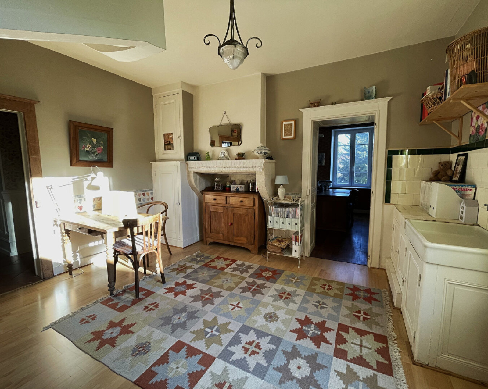 Au rez-de-chaussée, une entrée spacieuse donnant sur une pièce de vie lumineuse avec un poêle alsacien, une cuisine entièrement équipée ( four, plaque, hotte, micro-ondes), un espace bureau avec parquet de chêne, un second salon chaleureux idéal pour des moments conviviaux, WC indépendant et une buanderie.