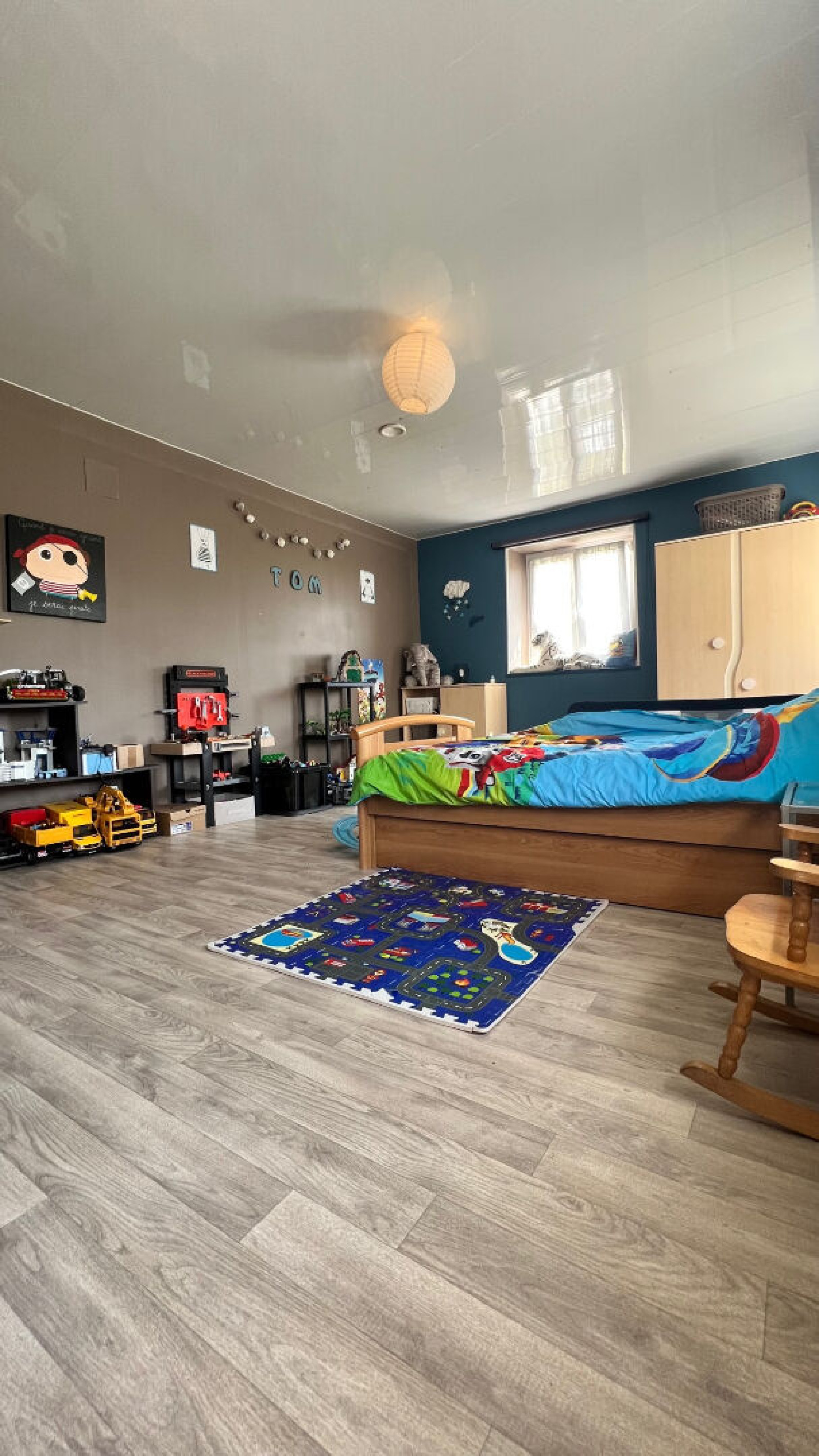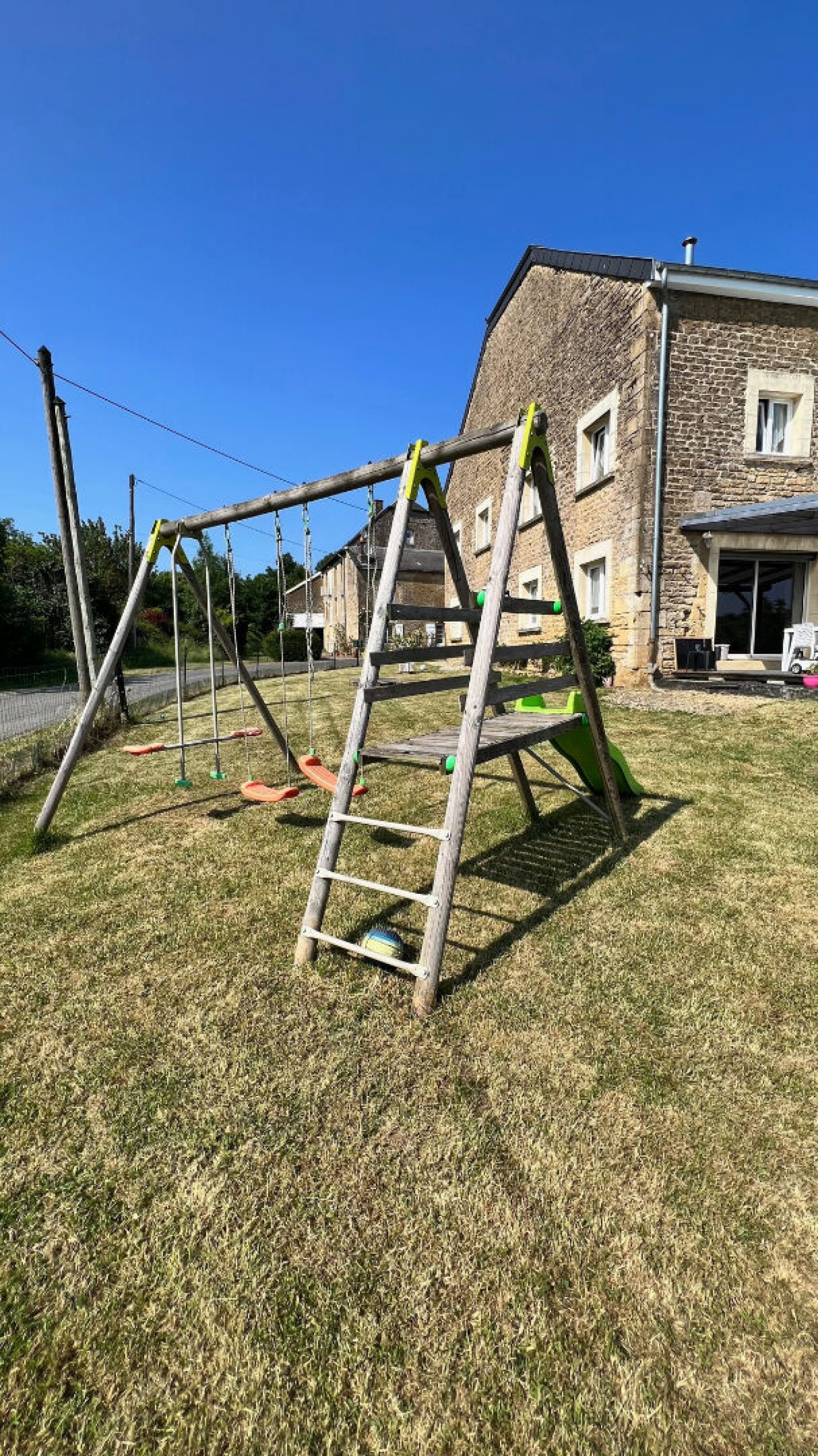 Un extérieur calme et arboré de 870 m2 avec aire de jeux trampoline et balançoire.