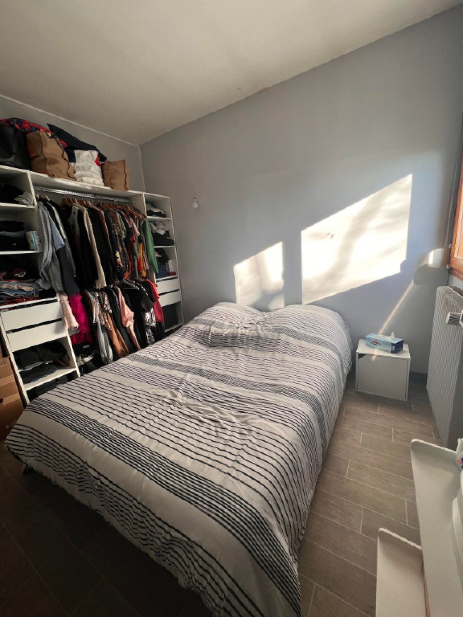 RDC : Entrée, salon séjour avec accès balcon, cuisine équipée bois, dégagement, WC indépendant, salle d'eau récente ( douche et sèche-serviettes), 2 chambres, un grand placard.