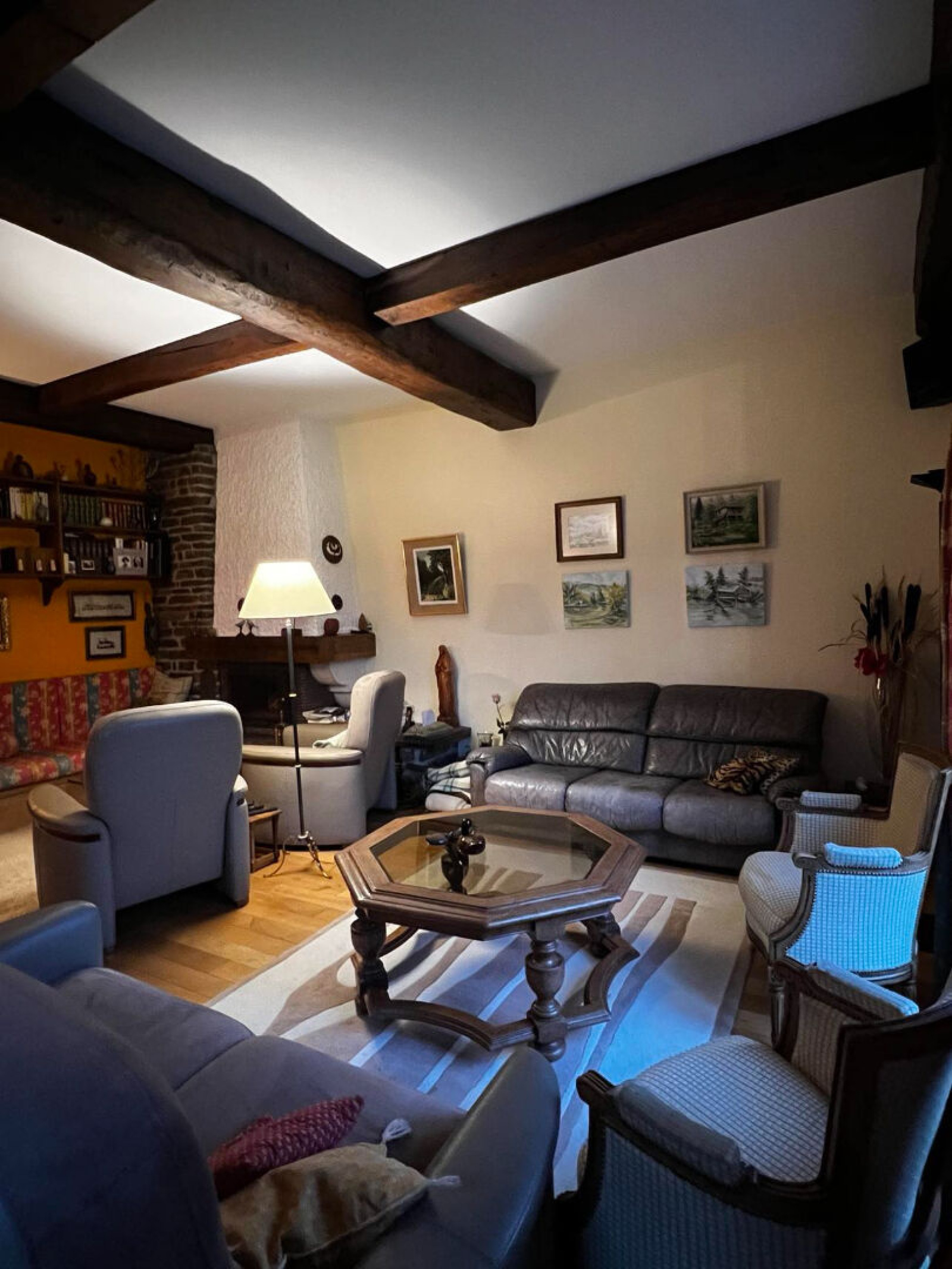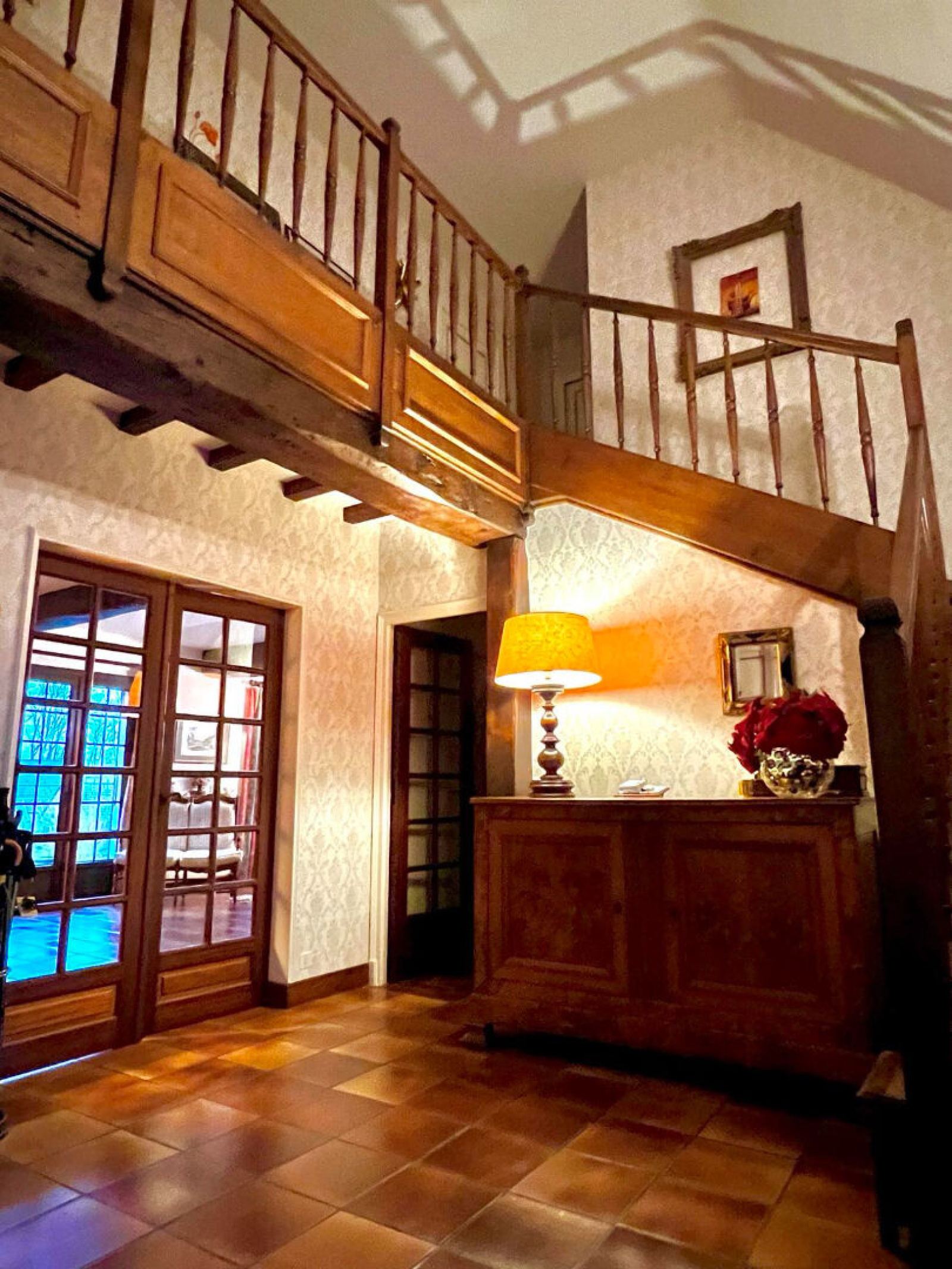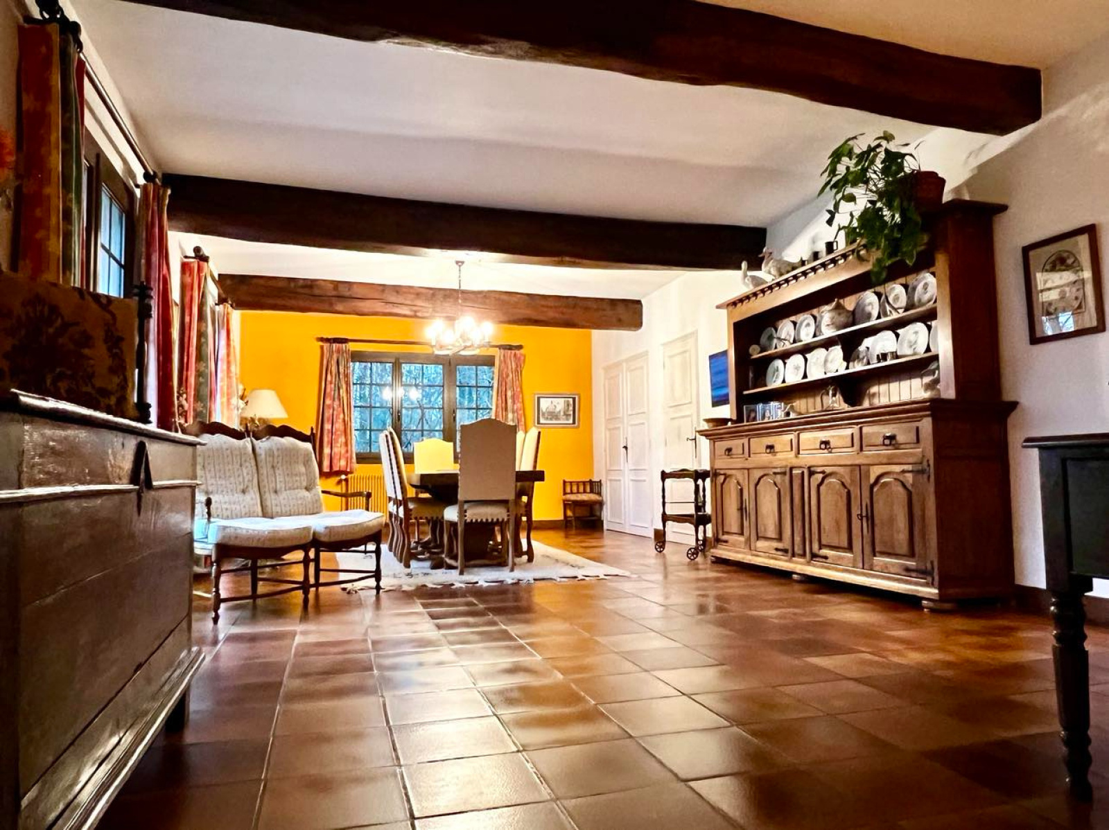 1er étage: Montée d'escalier en chêne donnant sur un palier desservant 4 chambres dont une avec sa salle d'eau privative (douche et vasque) . Une salle d'eau et un wc indépendant, grenier. Sous-sol complet avec atelier, cave à vins, cave à bois et chaufferie. Terrain clos avec terrasse (8400m2) Espace de stockage ( dépendance) Portail motorisé.