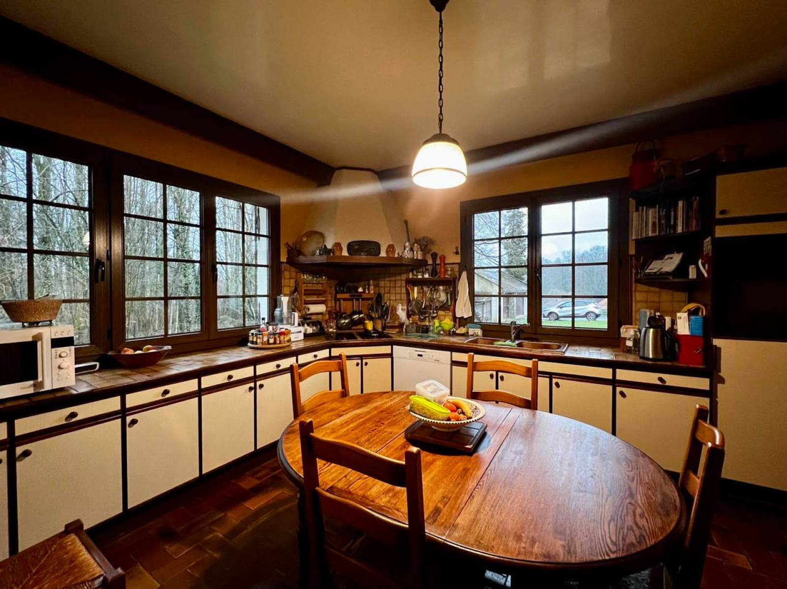 RDC: vaste hall d'entrée desservant une pièce de vie de près de 80 m2 avec insert bois et nombreuses portes fenêtres donnant sur le parc. Une lingerie, un bureau, un cabinet de toilettes et une cuisine séparée.