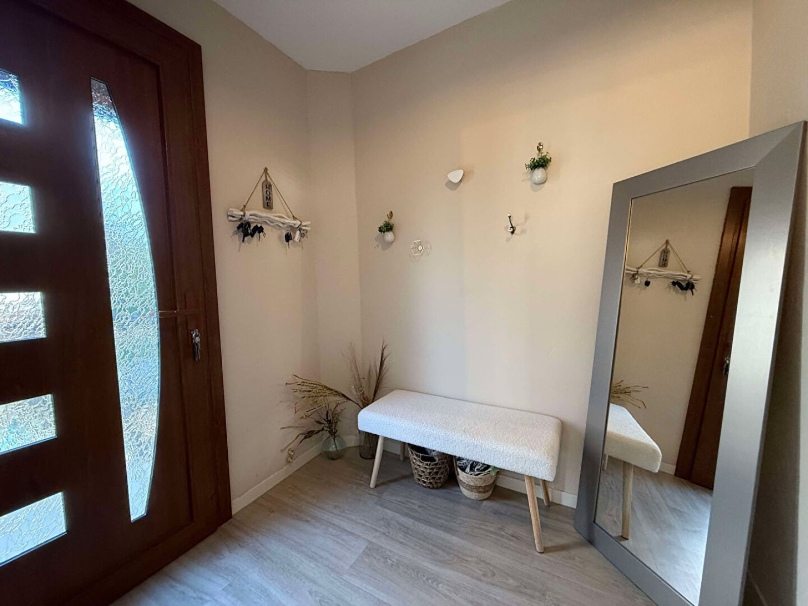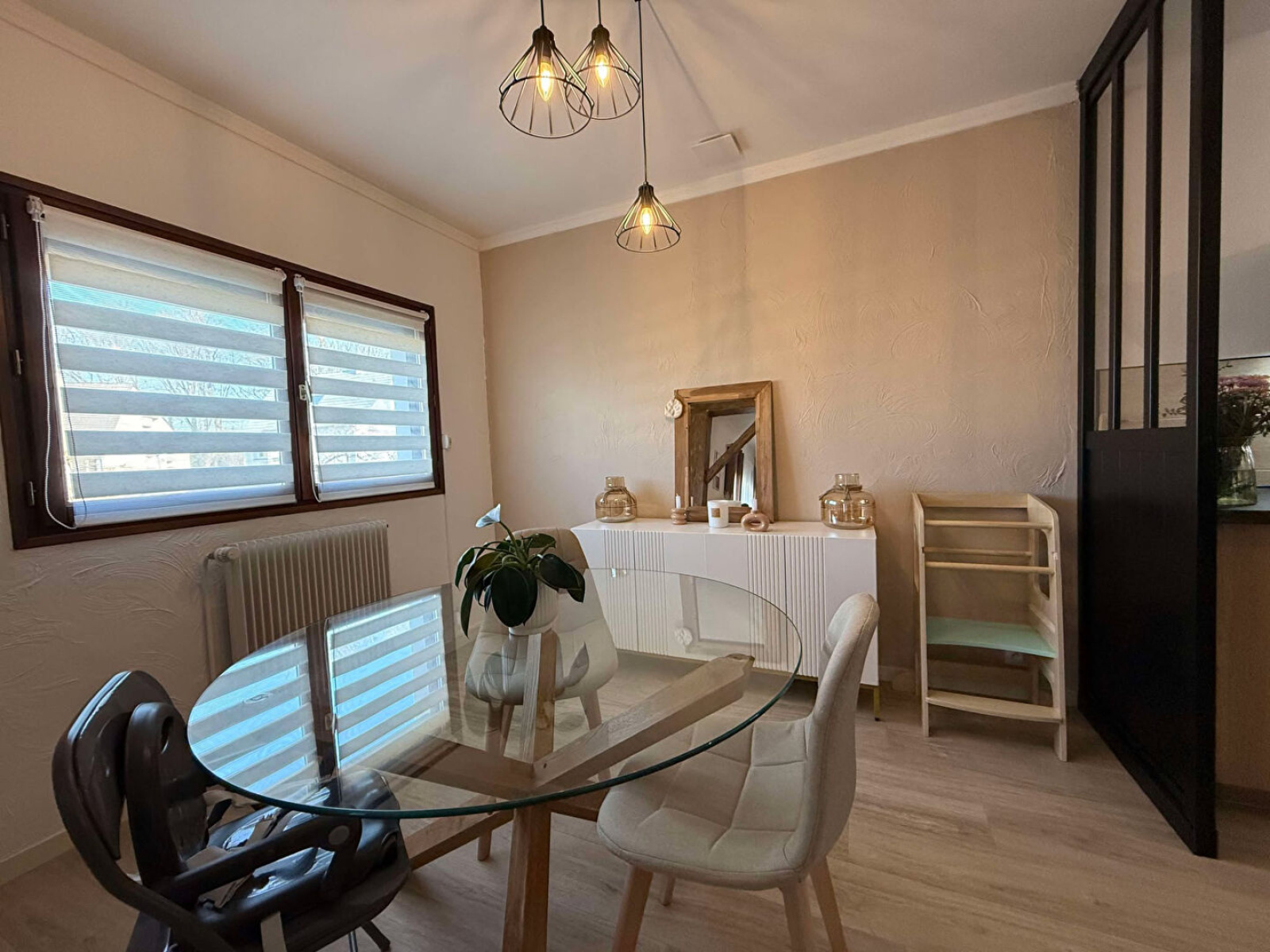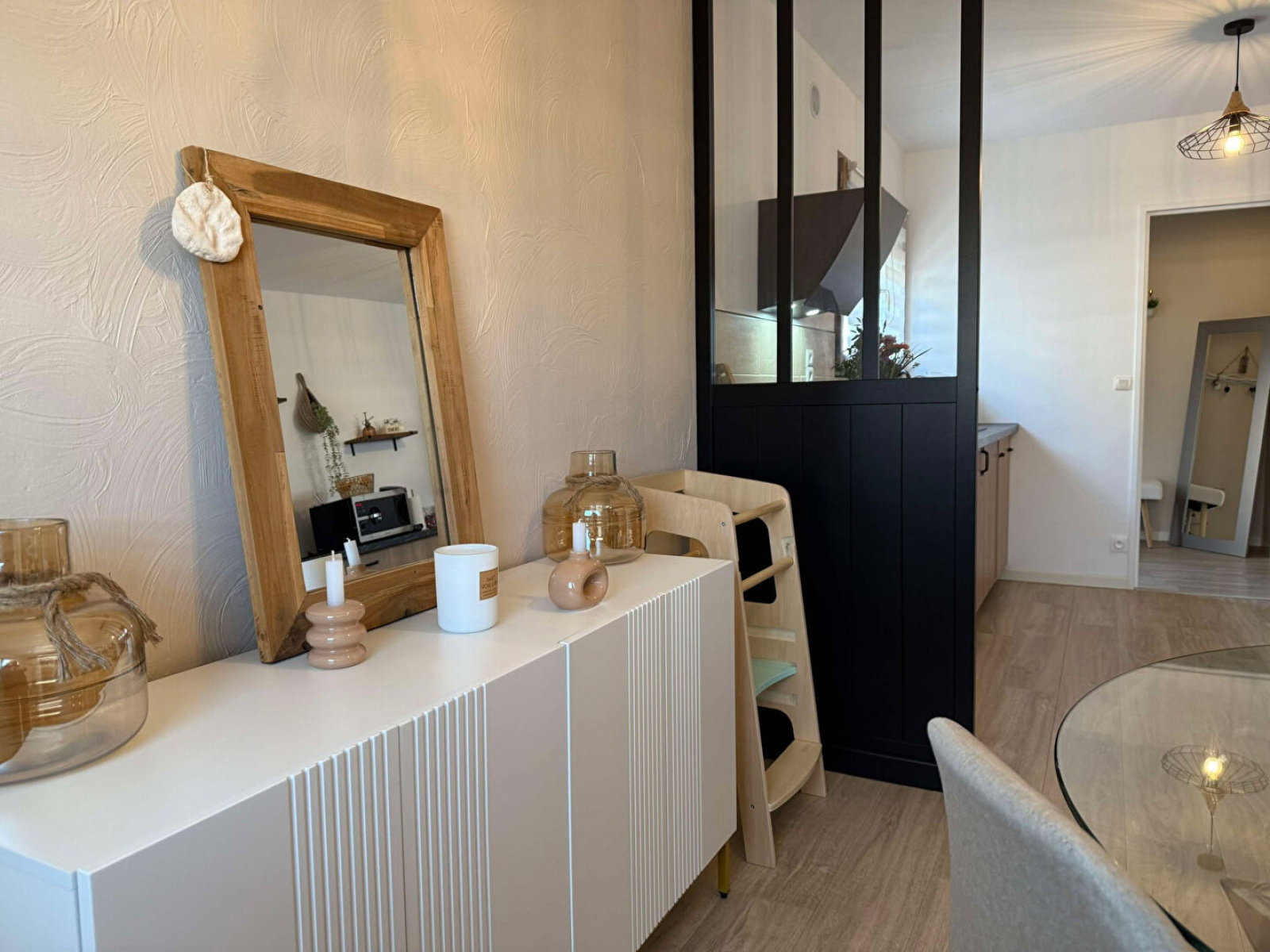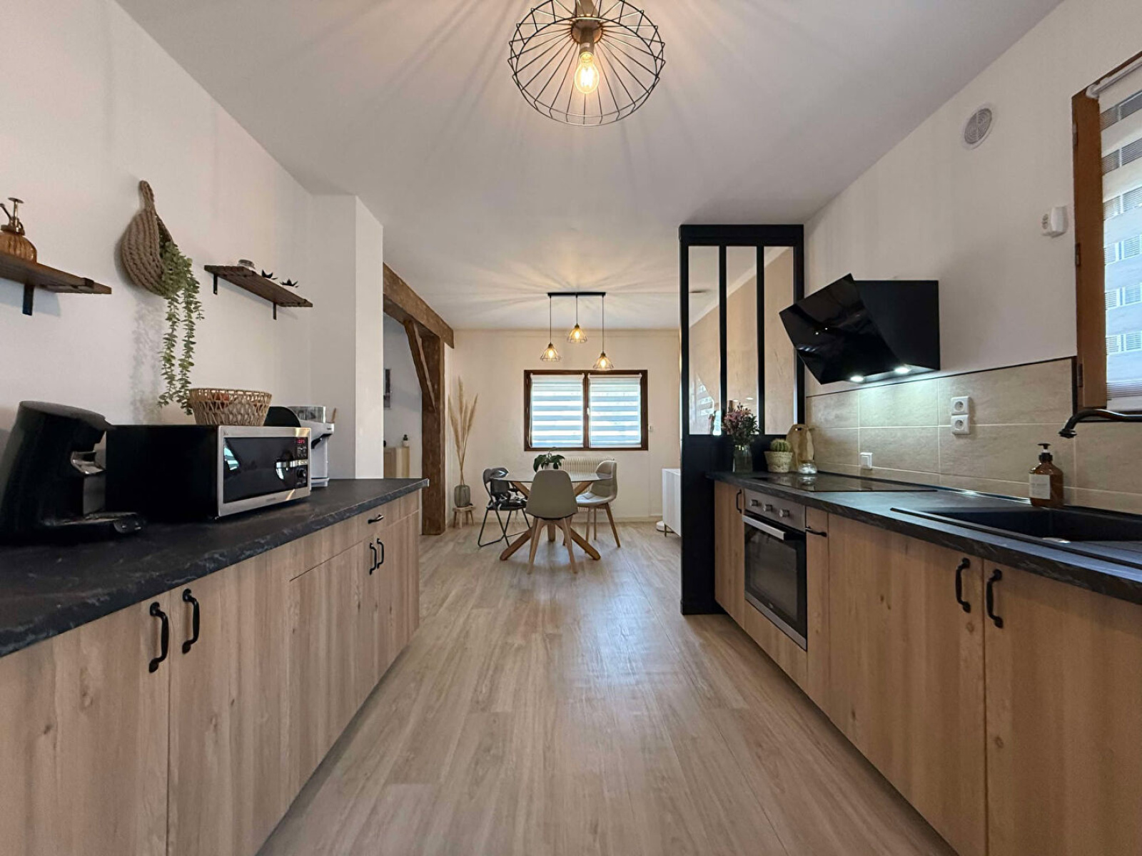 Rez-de-chaussée : Entrée, cuisine équipée (lave-vaisselles, four, plaque induction, hotte, plan de travail + éléments bas), dégagement, une salle d'eau, deux chambres, un débarras.