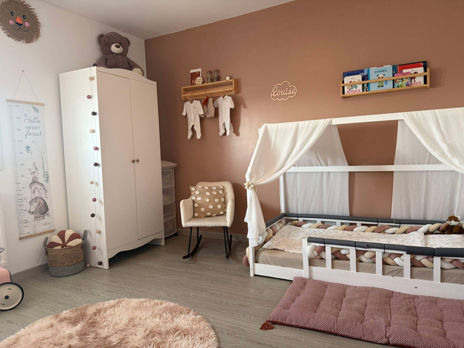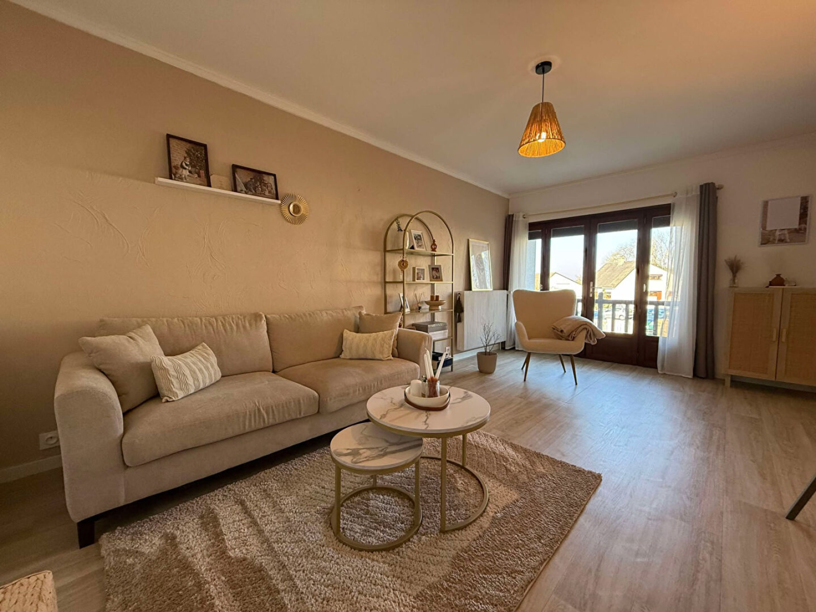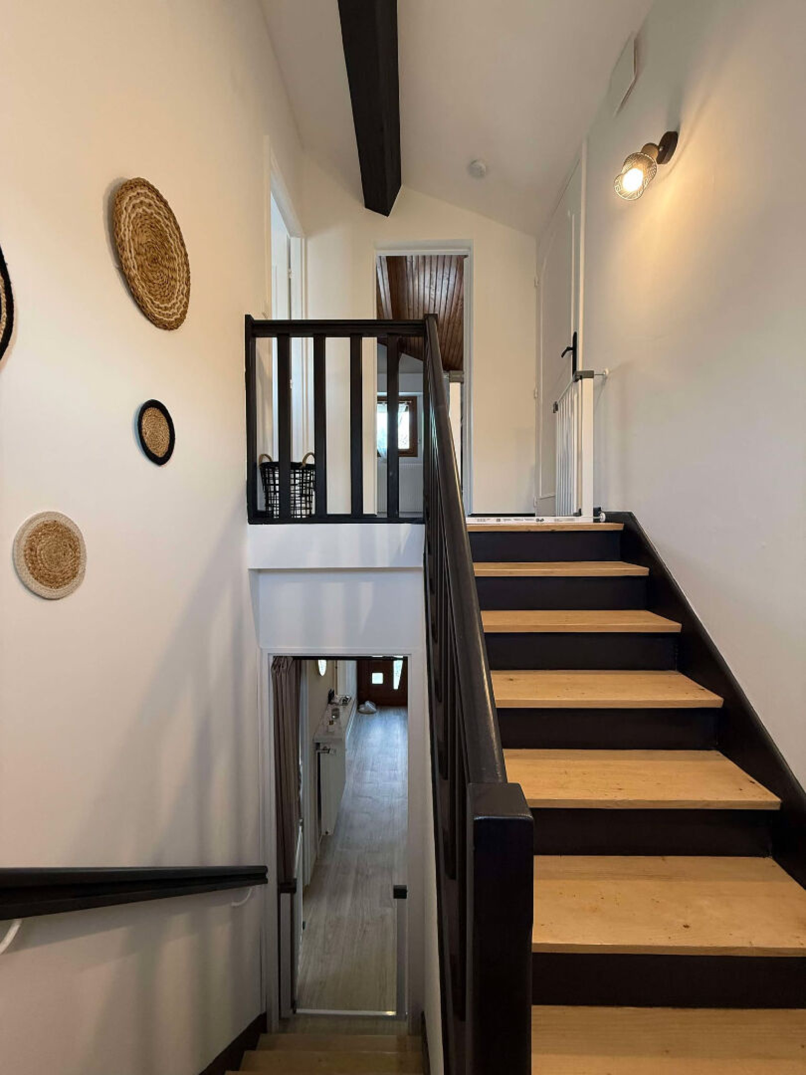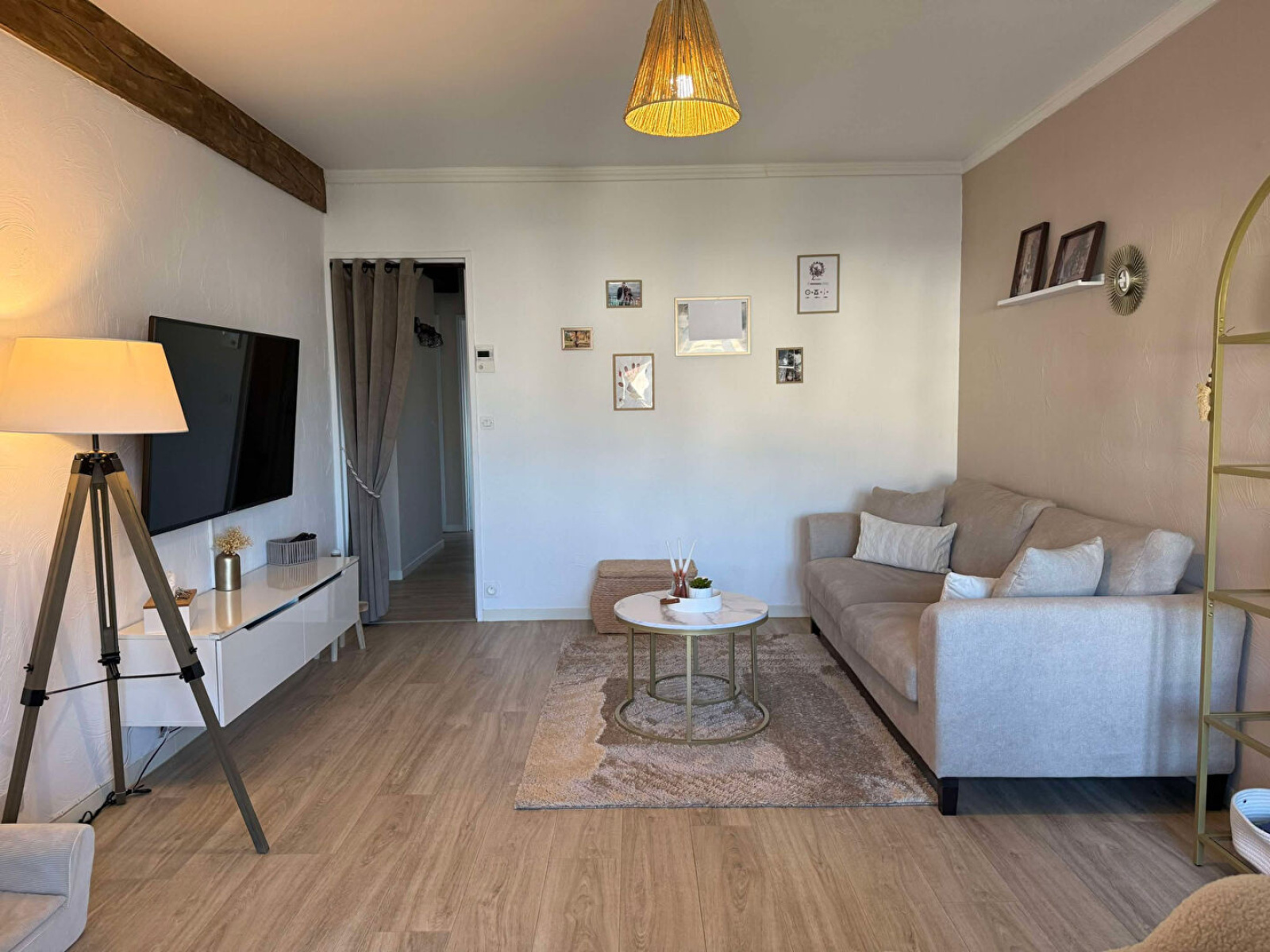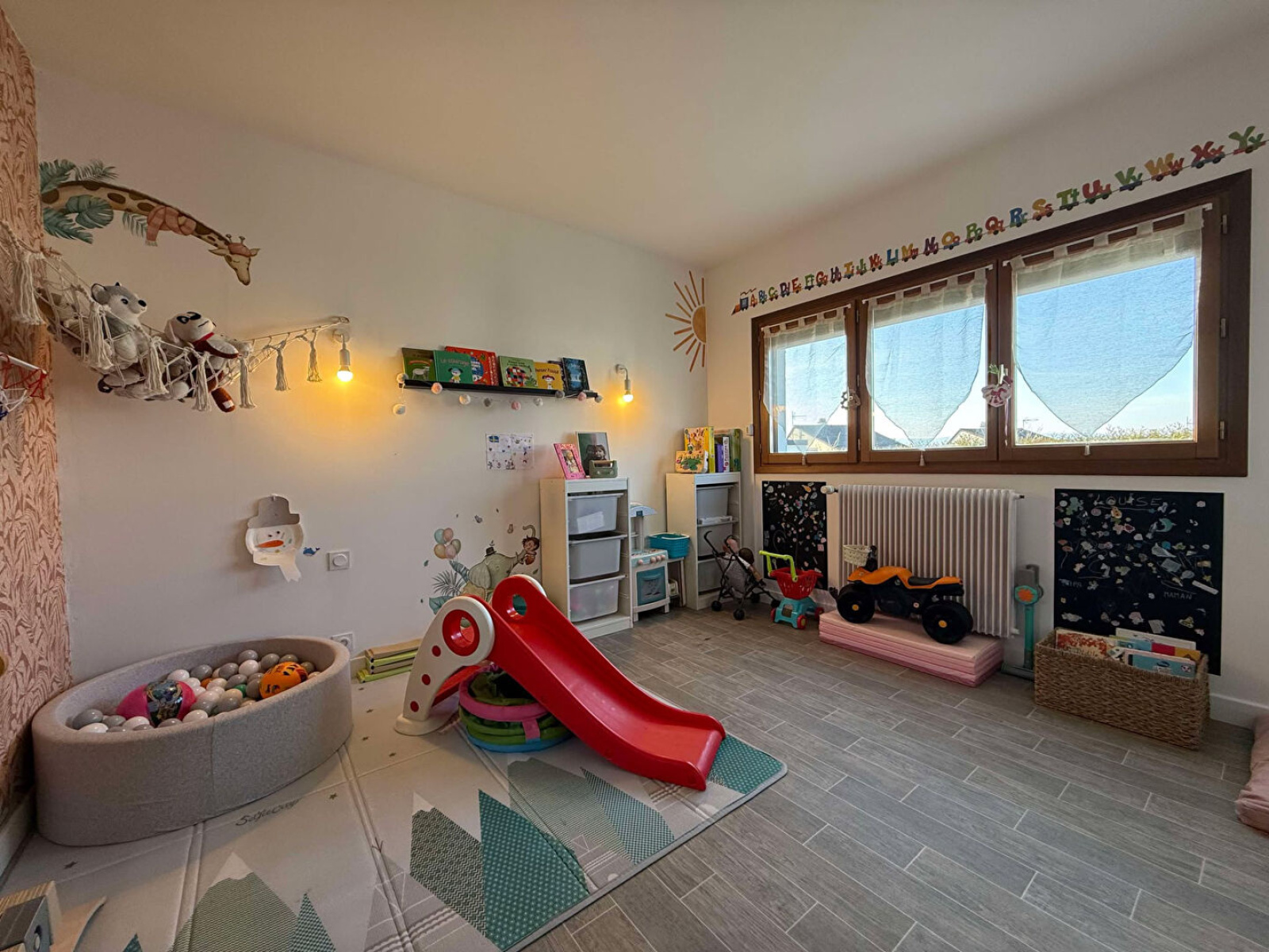 Rez-de-chaussée : Entrée, cuisine équipée (lave-vaisselles, four, plaque induction, hotte, plan de travail + éléments bas), dégagement, une salle d'eau, deux chambres, un débarras.