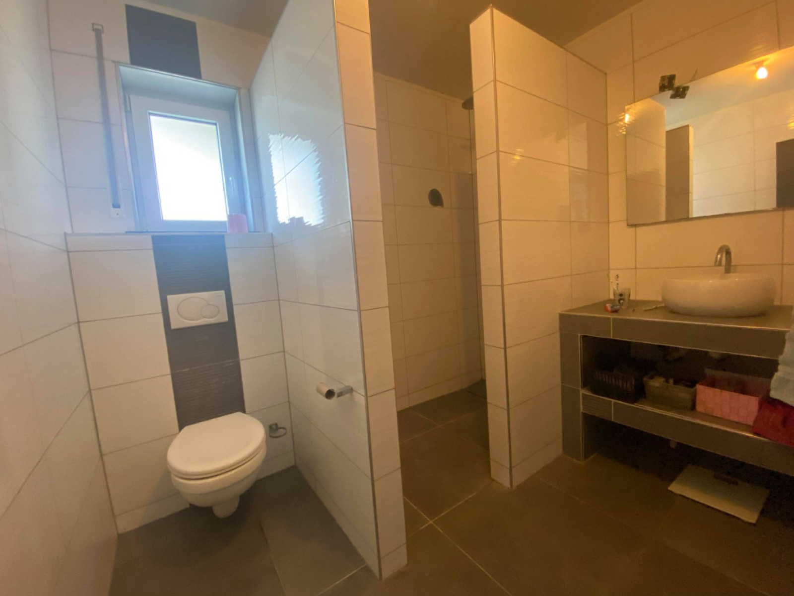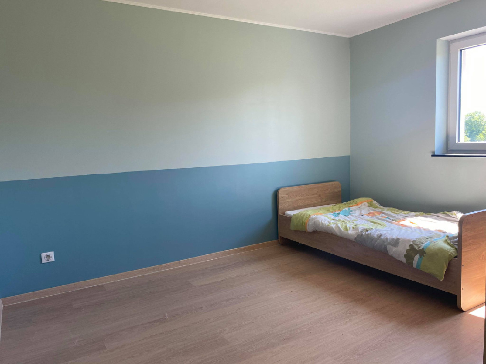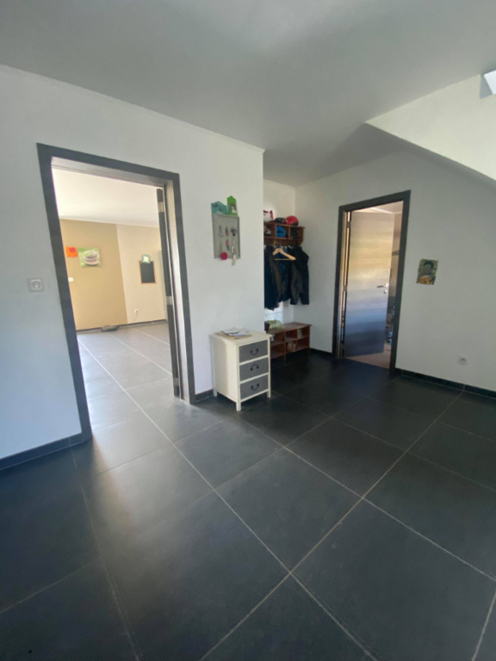 RDC : Entrée,1 bureau (ou 1 chambre), vaste salon-séjour avec poêle scandinave (pierres chaudes) , cuisine équipée avec accès sur terrain, 1 salle de jeux (ou 1 chambre), 1 lingerie, 1 salle d'eau ( 1 douche, 1 vasque, 1 wc suspendu).