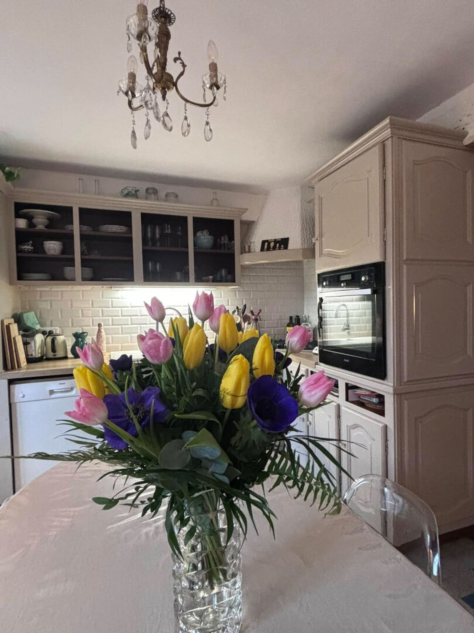 1er étage : Palier, 3 chambres, 1 salle d'eau récente. Extérieur : Terrasse/jardin, garage. Chauffage électricité (RDC et 1er), poêle à bois (possibilité de mettre un poêle à granulés avec ventilation dans les pièces du haut).
