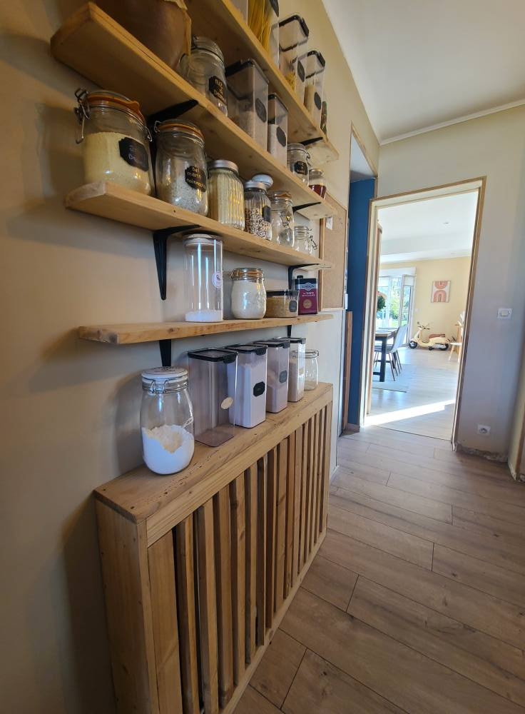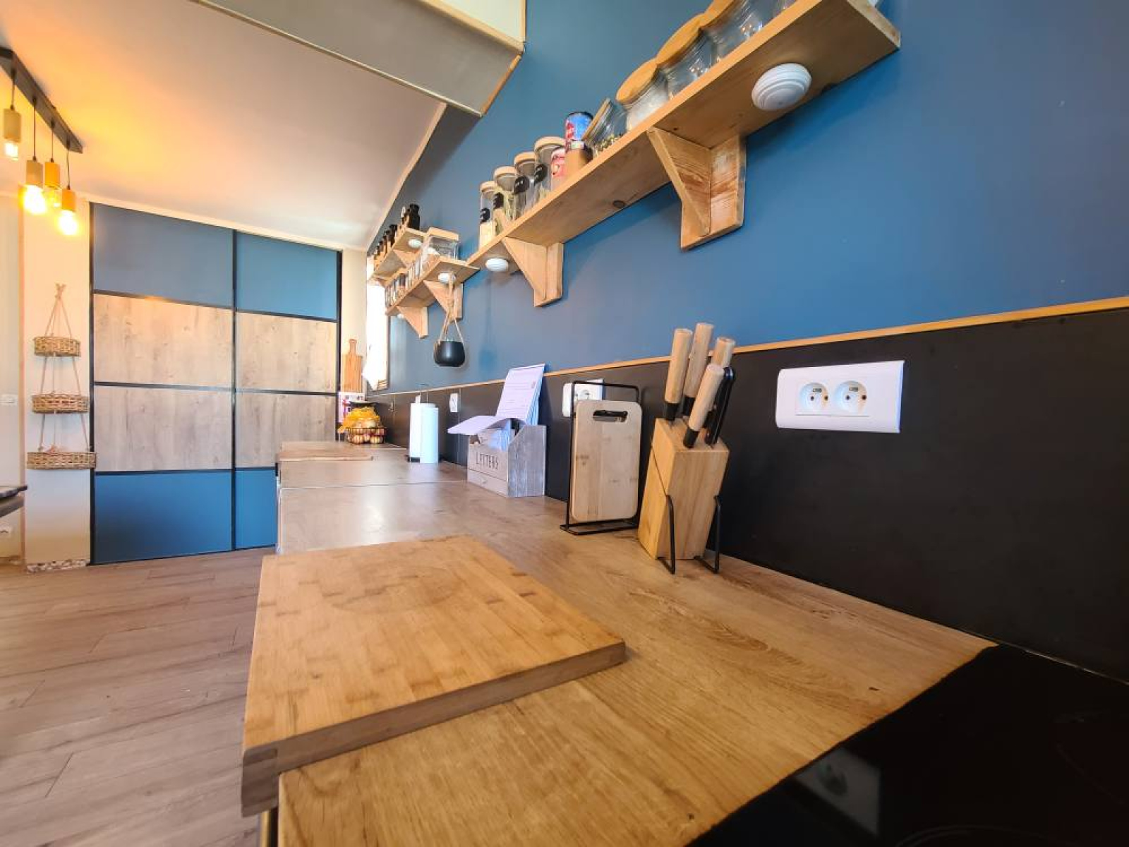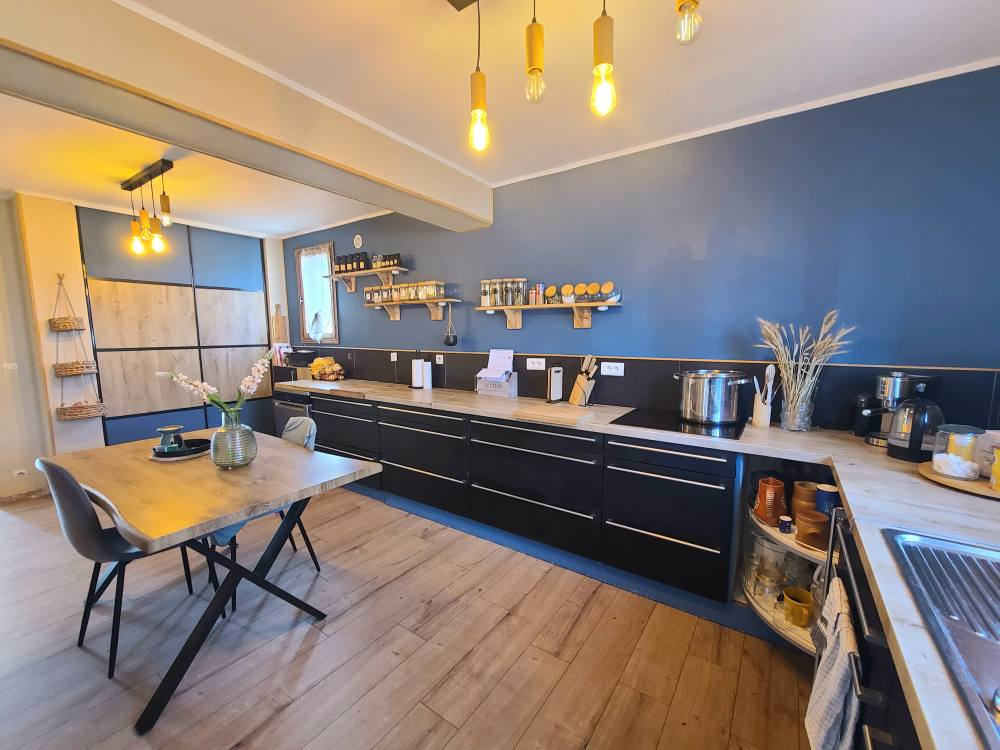Un couloir desservant une cuisine entièrement équipée, moderne et fonctionnelle, disposant de nombreux rangements