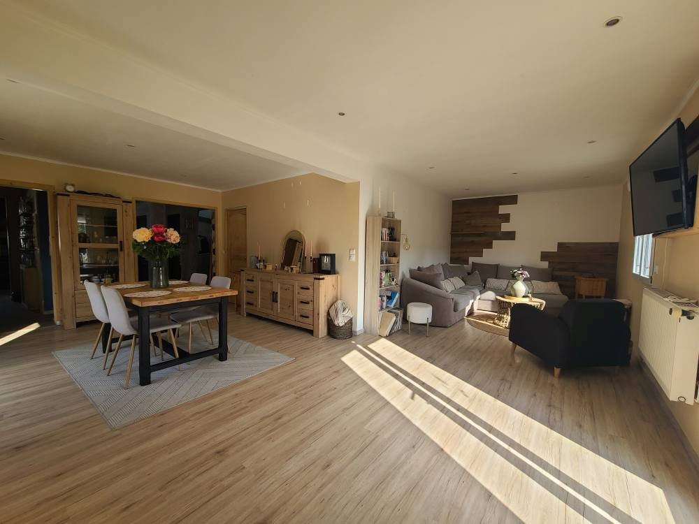 Une vaste pièce de vie lumineuse ouvrant sur le jardin, parfaite pour profiter des beaux jours en toute convivialité.