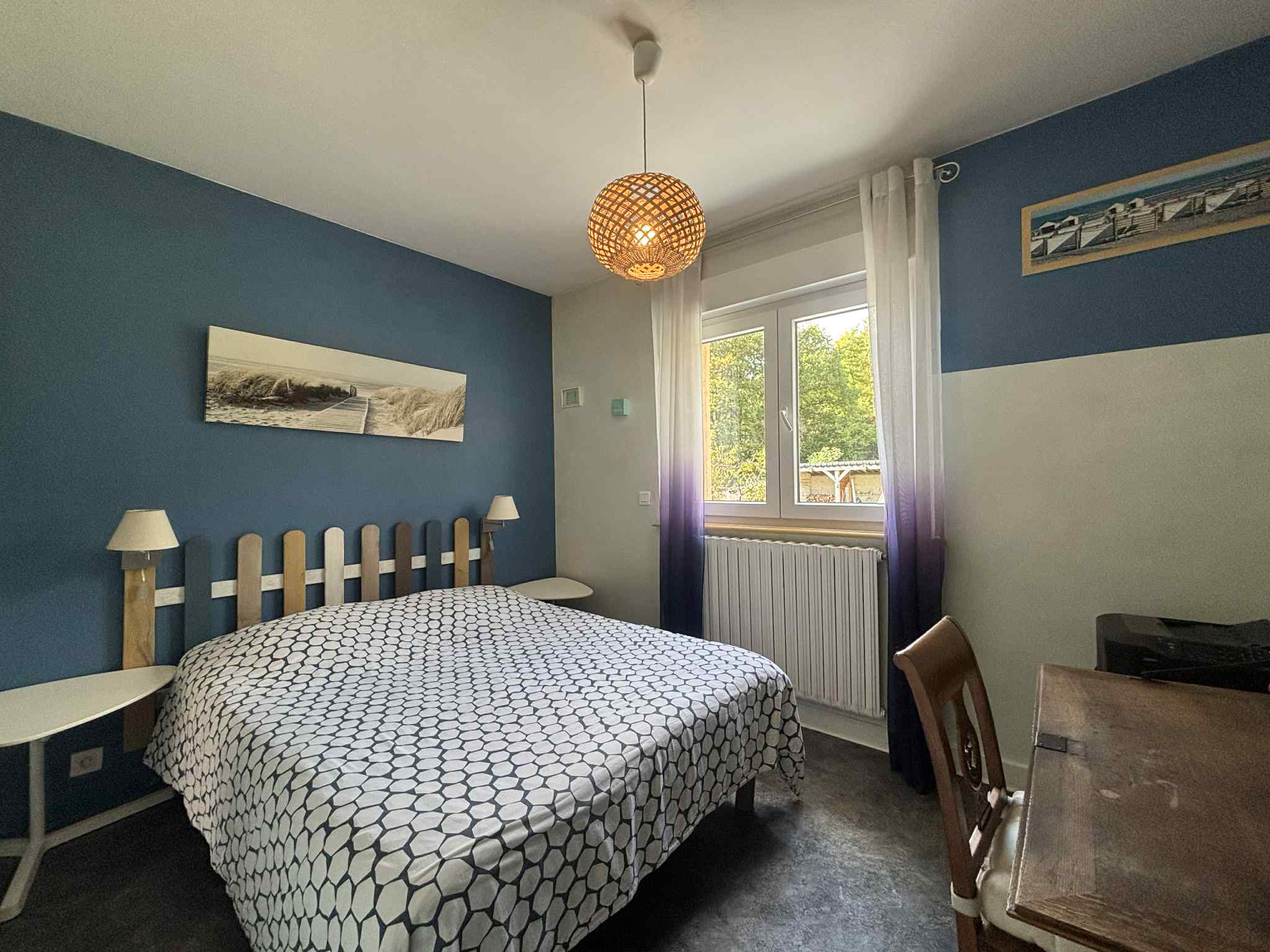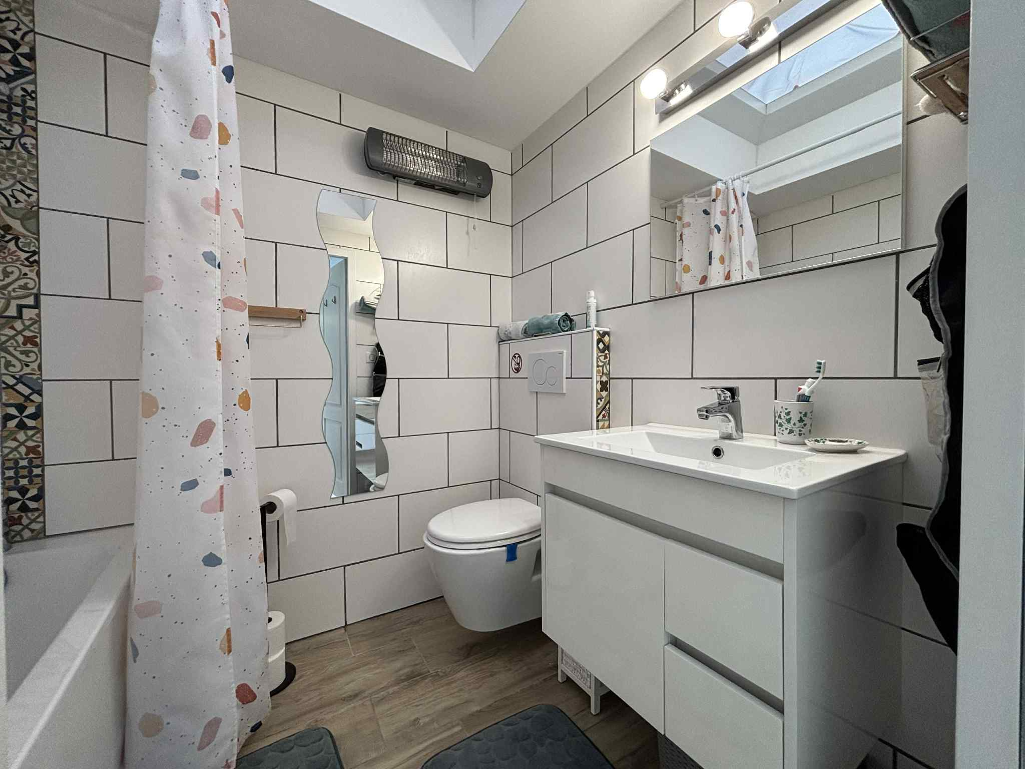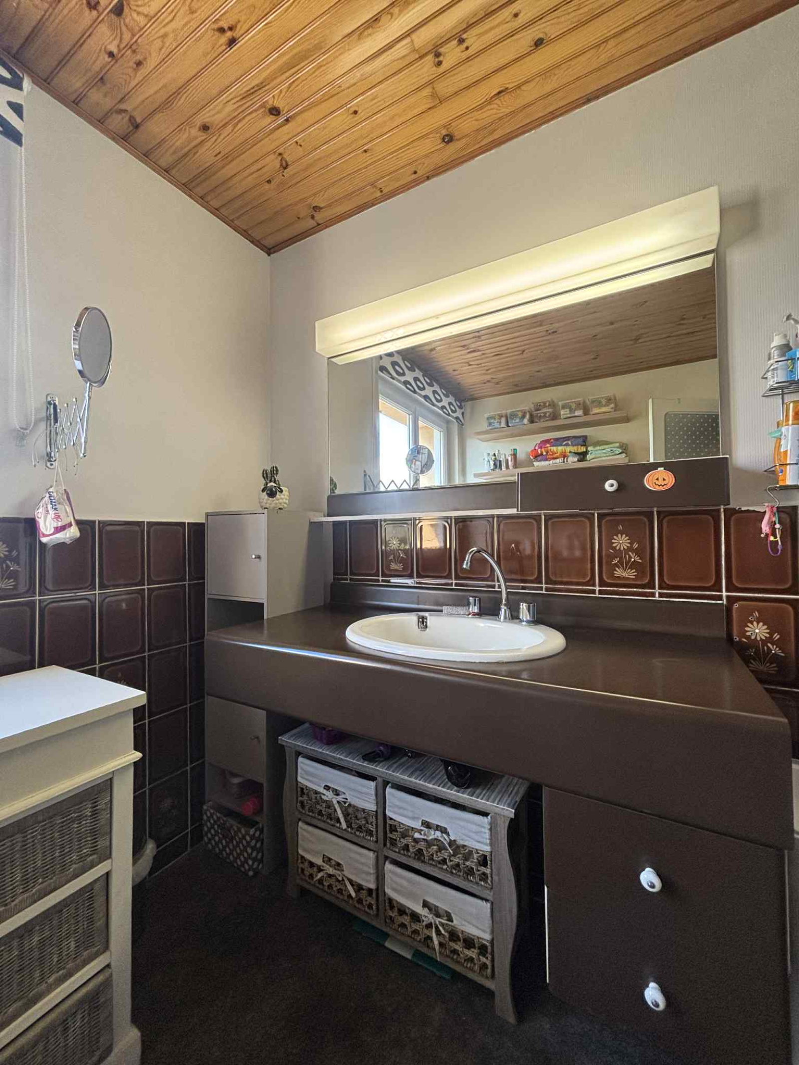 La maison offre trois chambres ainsi qu’une salle de bain avec WC et une salle d’eau avec WC, garantissant confort et praticité au quotidien.