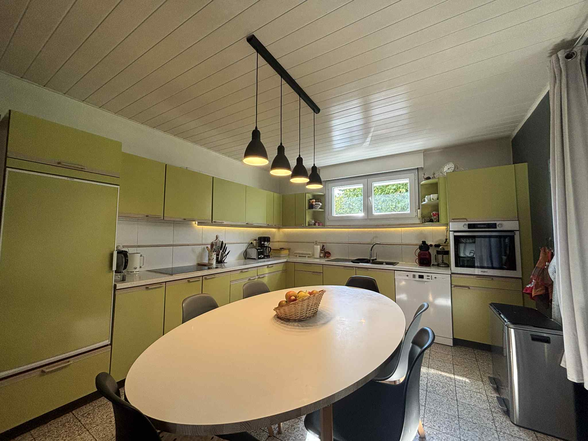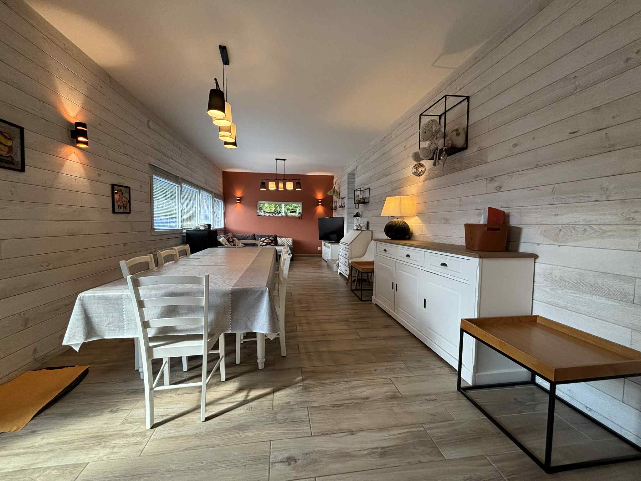 Une spacieuse pièce de vie réunit cuisine équipée, salle à manger et salon dans un espace lumineux ouvert sur terrasse, parfait pour profiter de moments conviviaux.