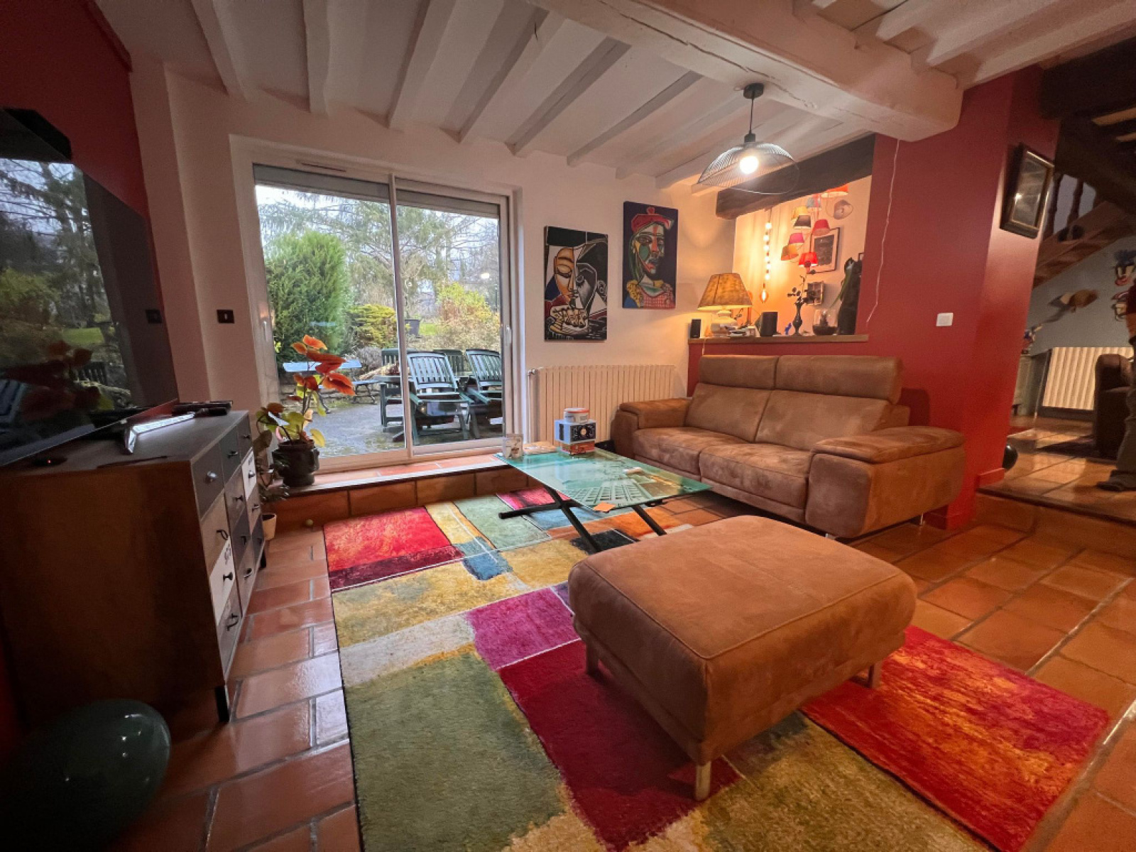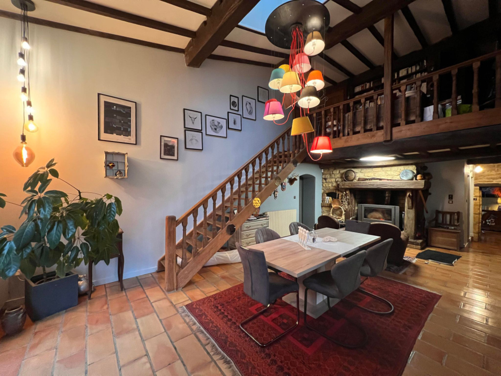 RDC : entrée, cuisine équipée (plaque, four, hotte, lave-vaisselle, micro-onde), placards,, salon avec cheminée, salon avec coin bar, vaste espace de vie salle à manger accès terrasse avec insert (invicta - de 10 ans), salle d'eau, wc indépendant.