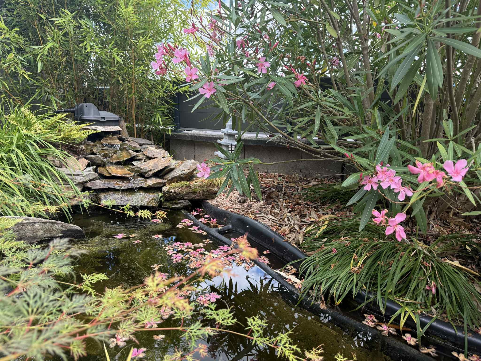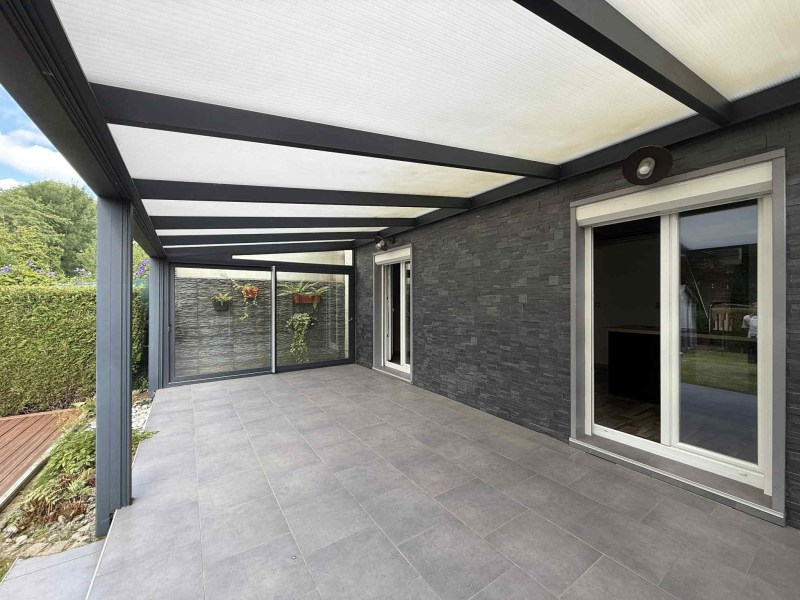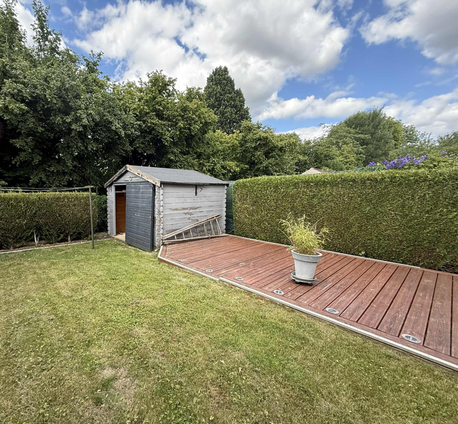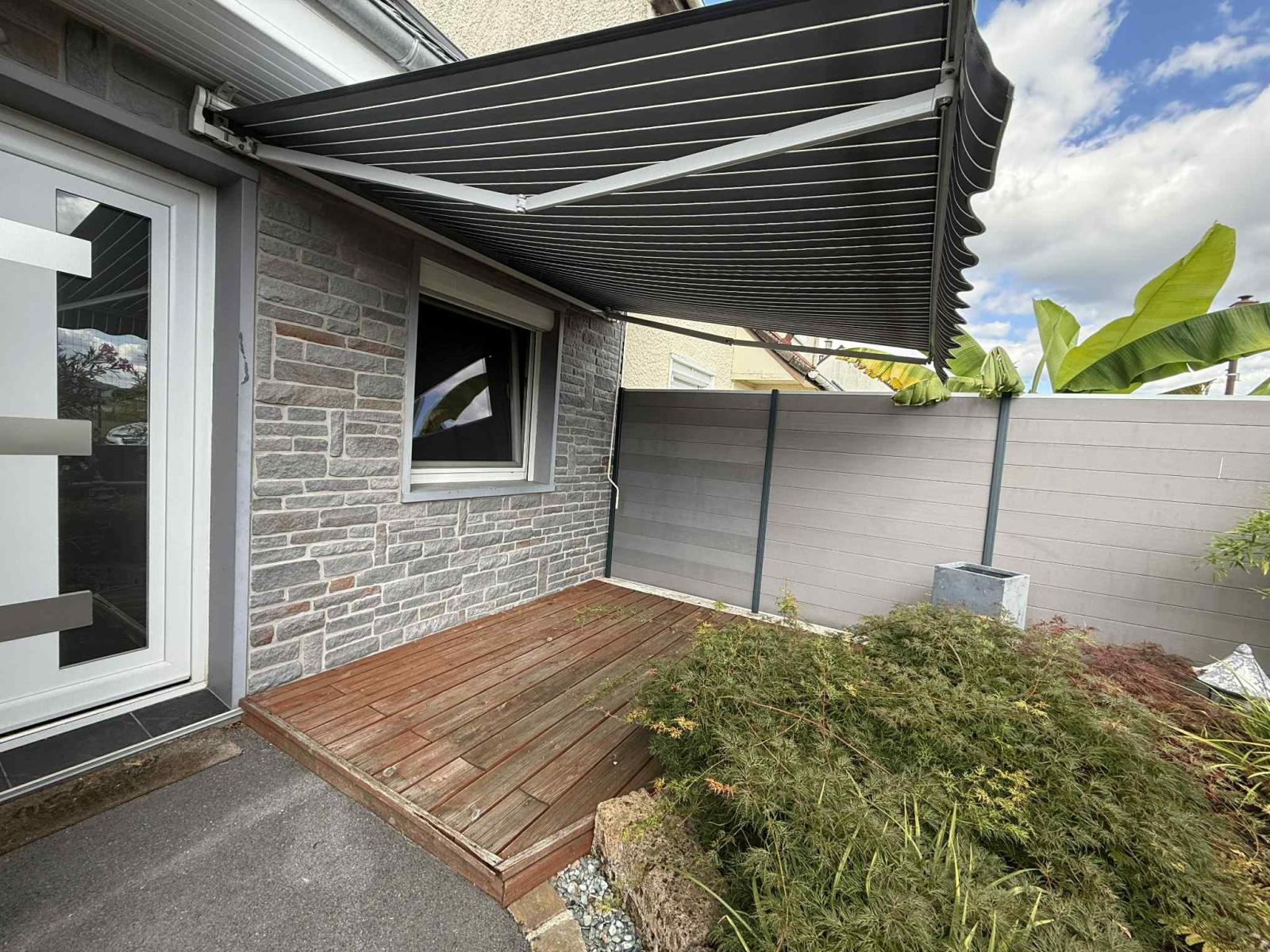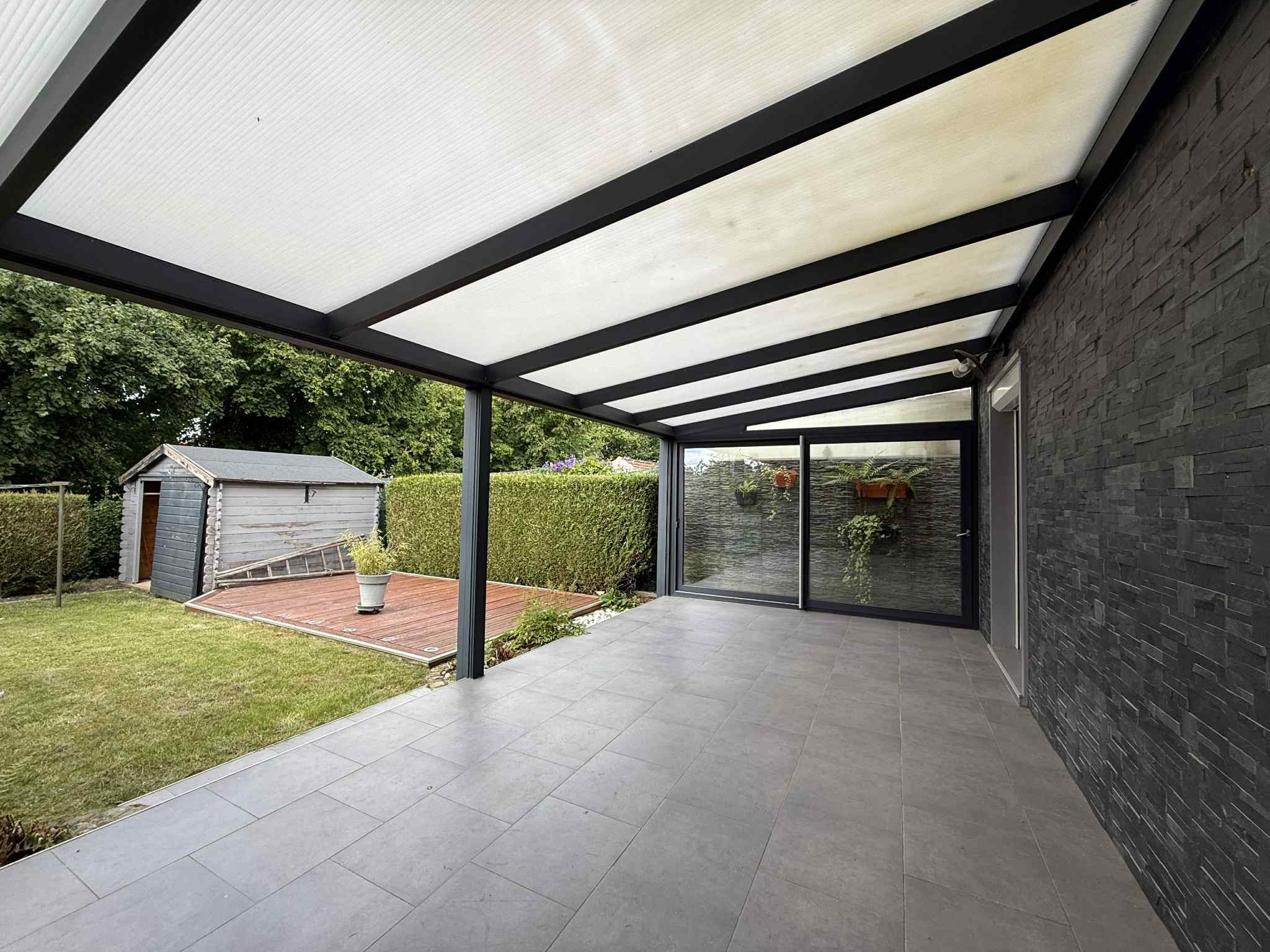 Extérieur: Deux terrasses en bois avant (avec store-ban) et arrière, une pergola en alu (crée en 2013), un châlet de jardin de 9m², un terrain de 220m²)