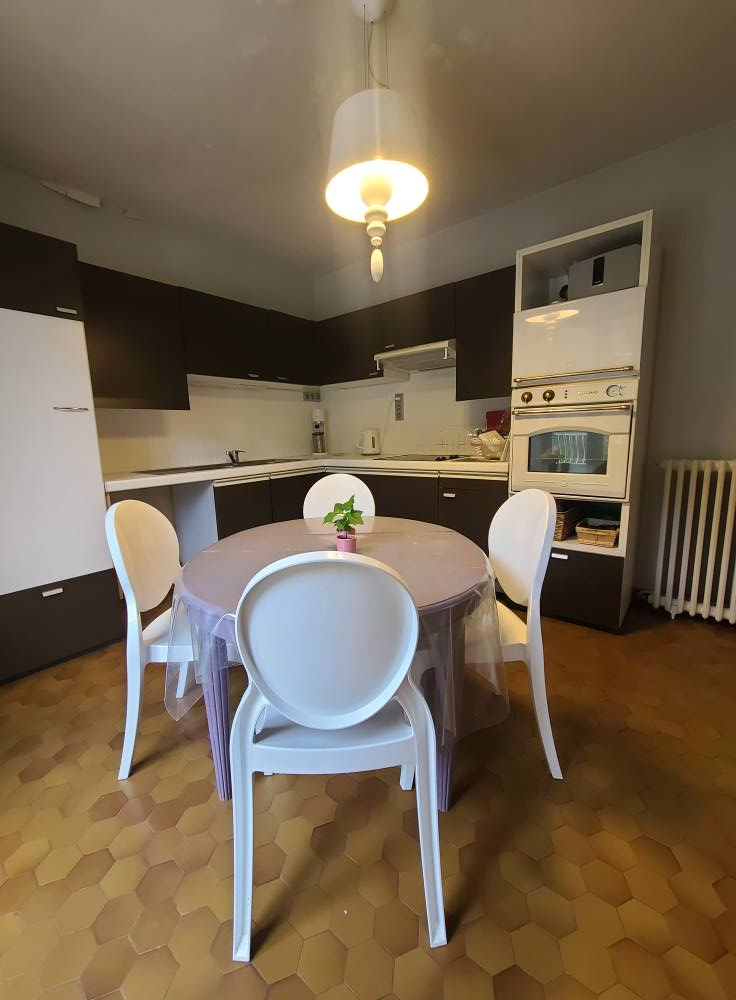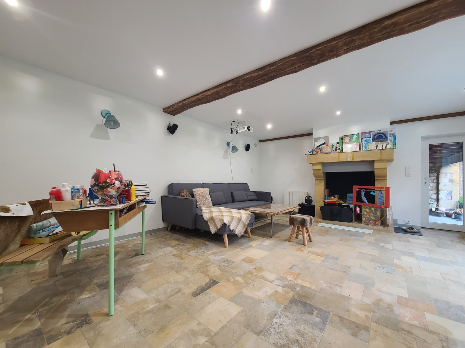 Hall d'entrée, cuisine équipée, salon avec poêle à bois, salle à manger, dressing, WC.