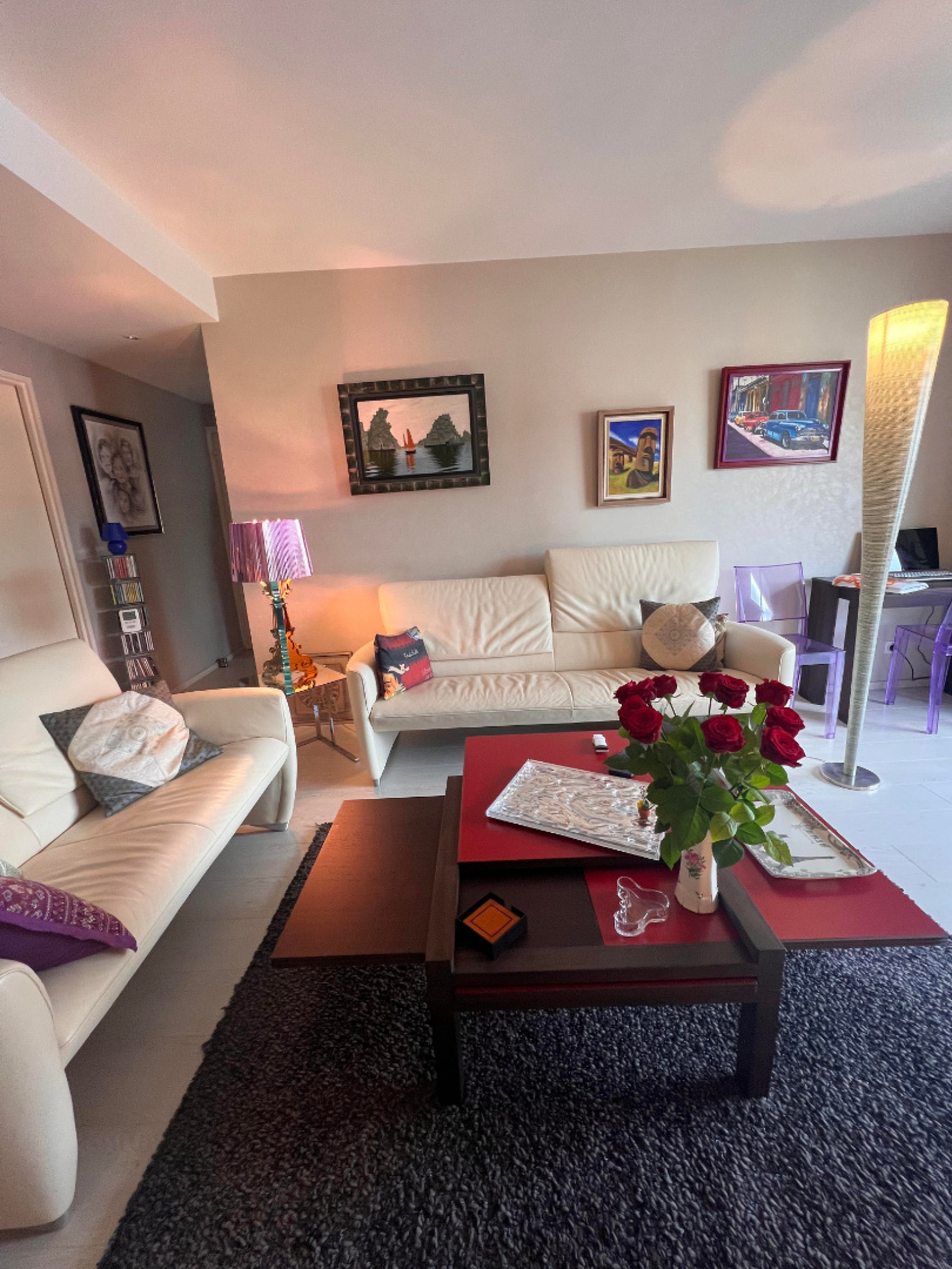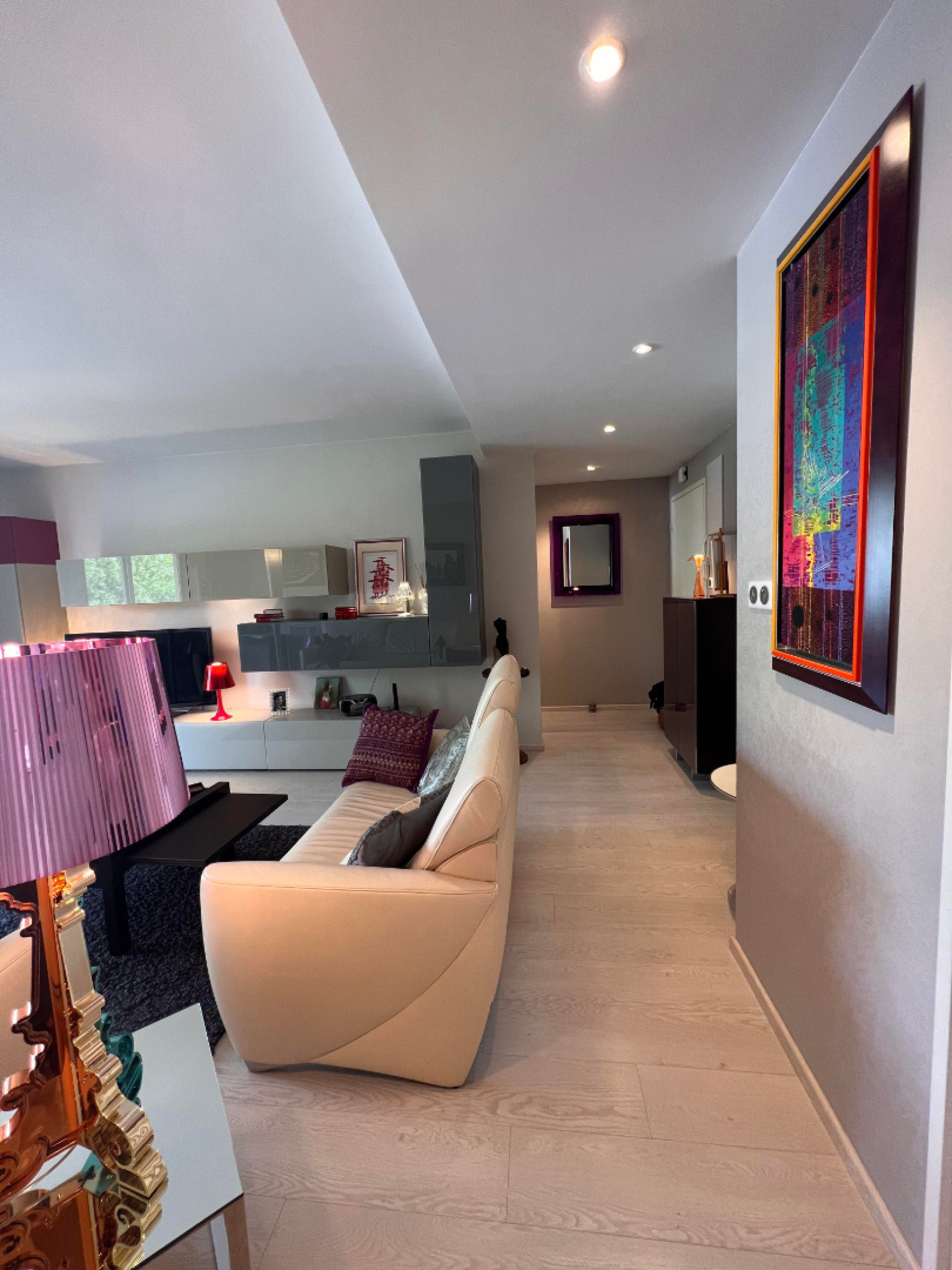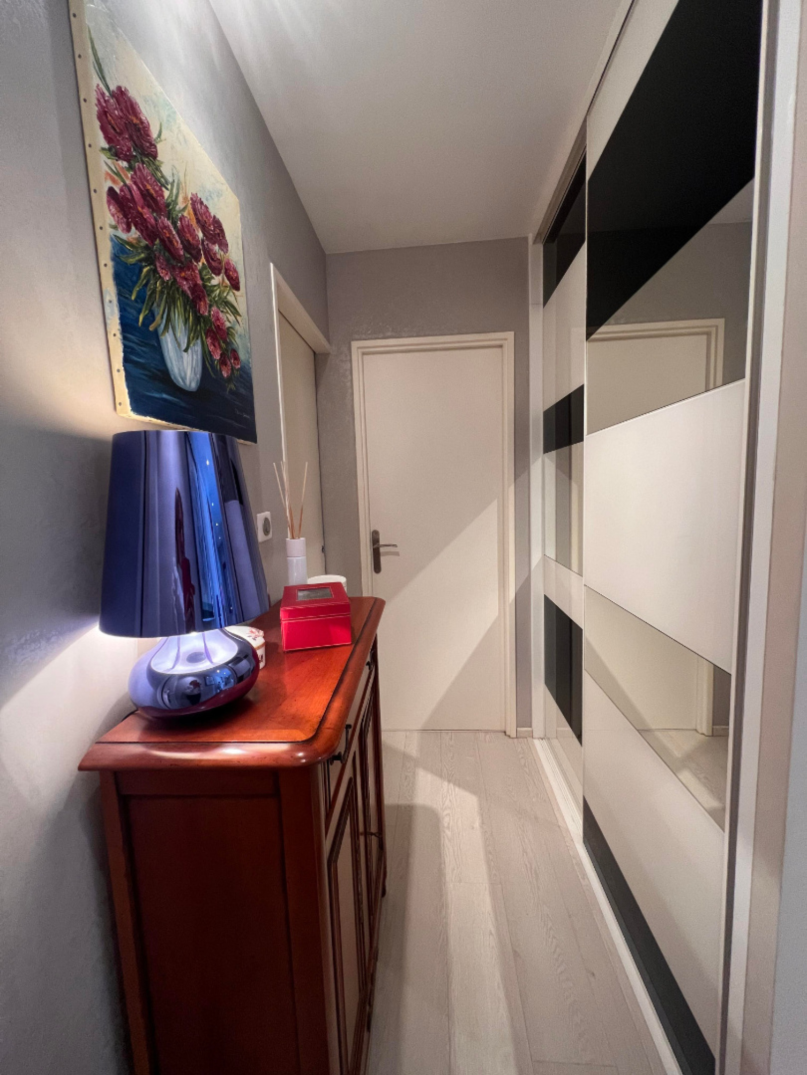Cet appartement comprend : Entrée avec porte sécurisée, dégagement avec placards, salon-séjour avec un accès balcon, cuisine équipée four, hotte, plaque, micro-ondes, frigo) avec accès balcon, dégagement, un débarras avec étagères et placards, une salle d'eau (douche, simple vasque, un sèche-serviettes), une chambre avec accès balcon.