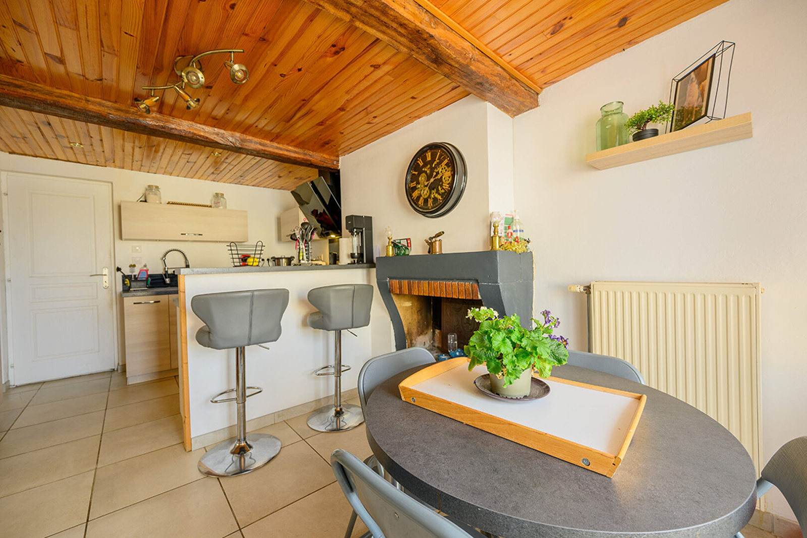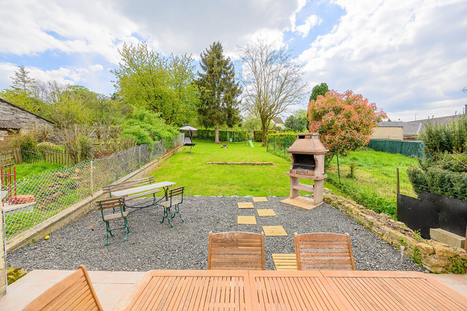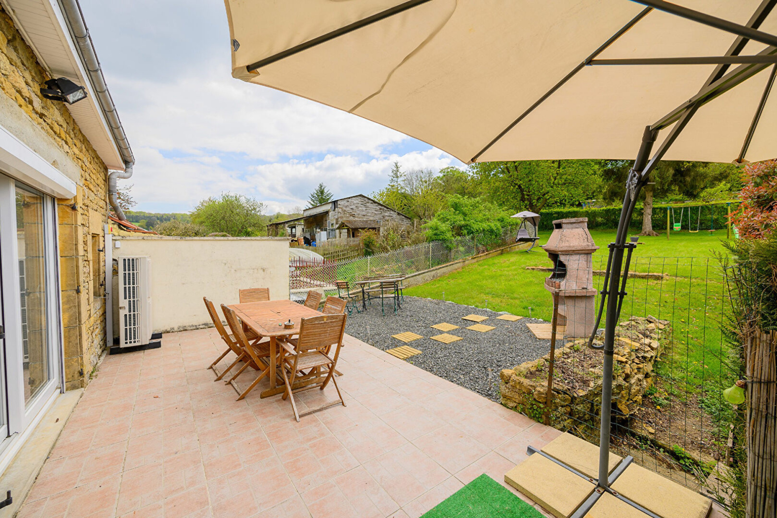 - 1er étage : cuisine équipée ouverte sur 1 vaste salon séjour, accès terrasse, sans vis à vis, et terrain, salle de bain (douche, baignoire et WC).