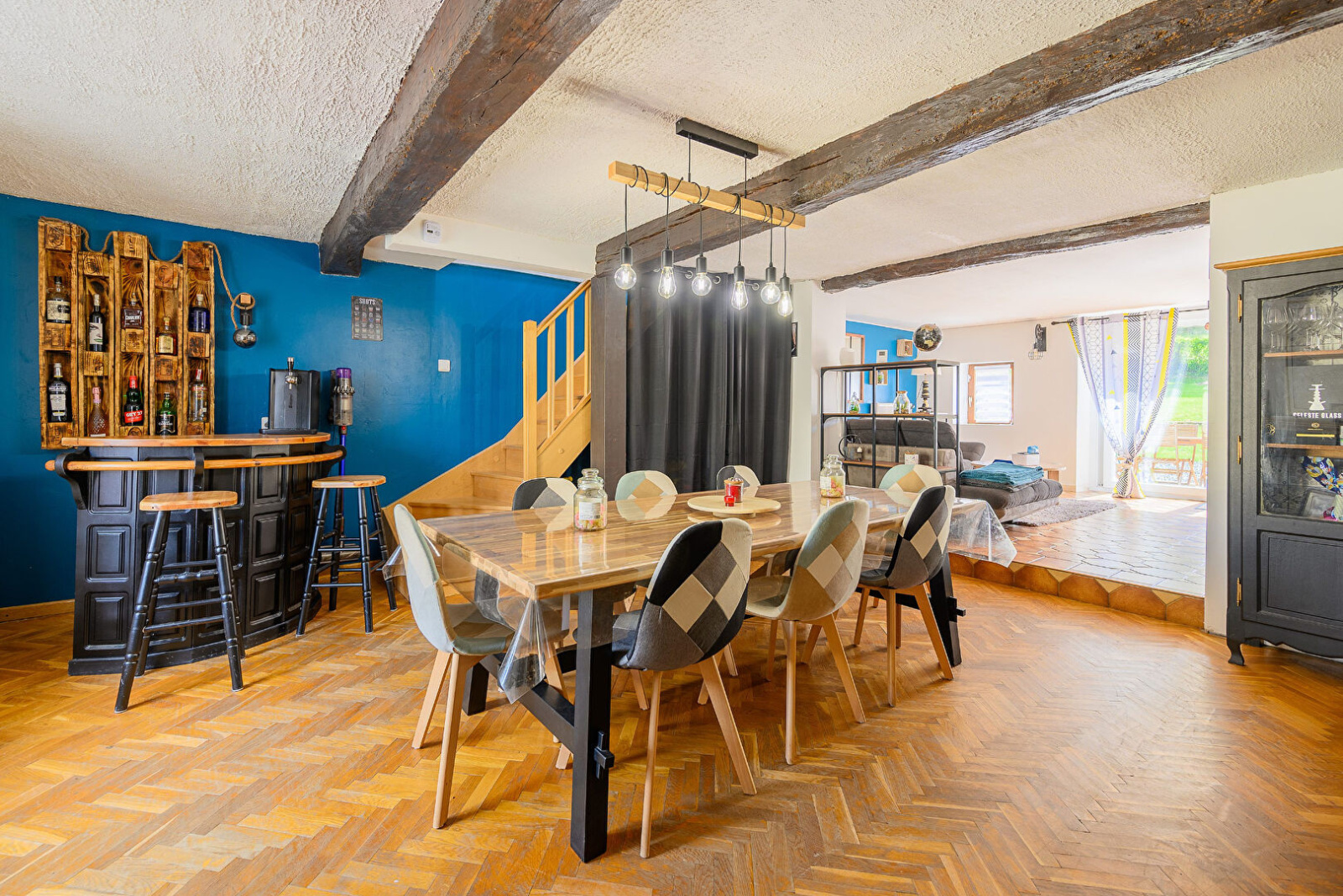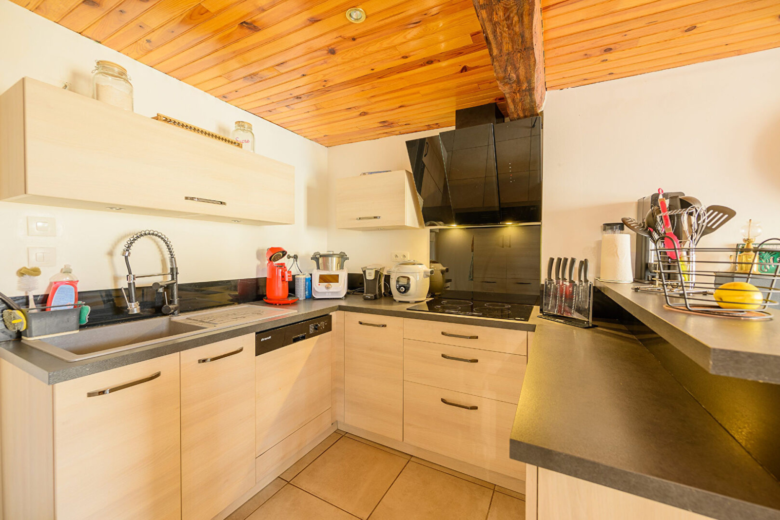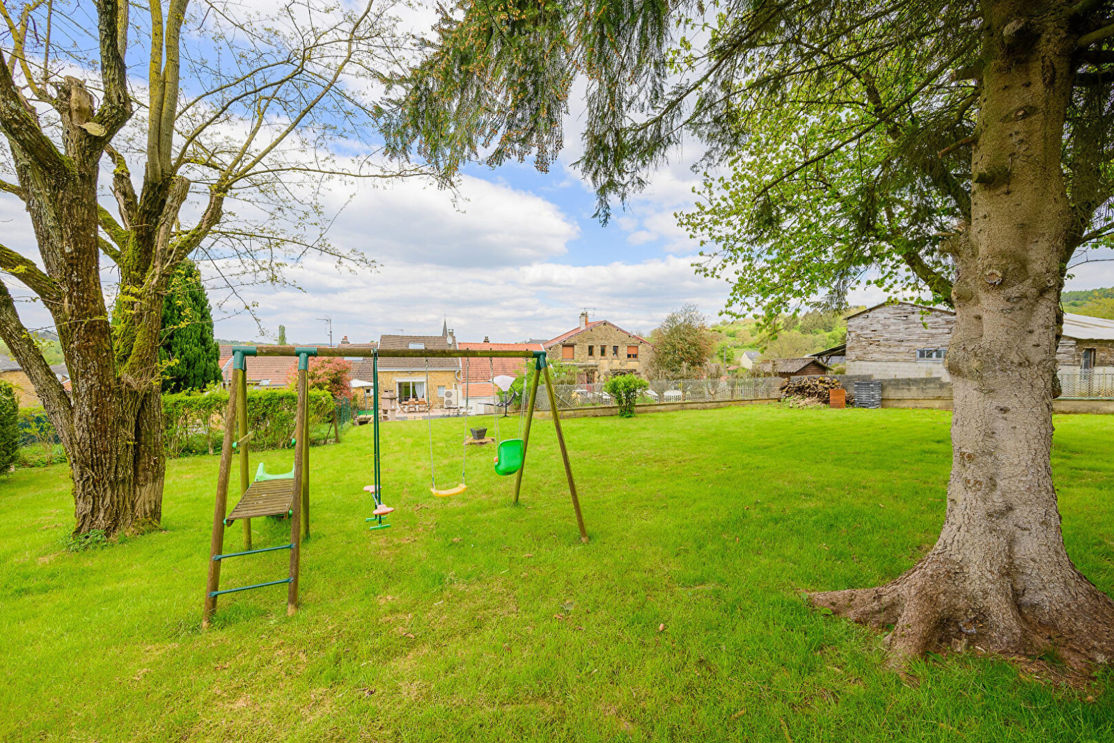 - 1er étage : cuisine équipée ouverte sur 1 vaste salon séjour, accès terrasse, sans vis à vis, et terrain, salle de bain (douche, baignoire et WC).